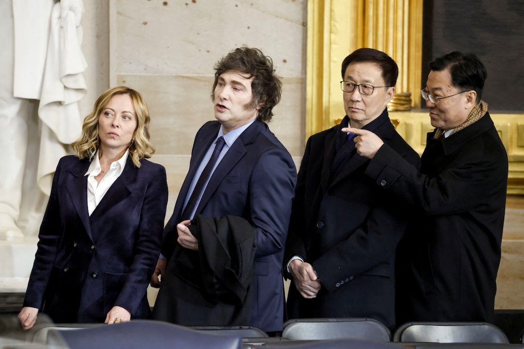 项目 1 共 2(从左到右)意大利总理乔治亚·梅洛尼、阿根廷总统哈维尔·米莱和中国副总统韩正,在美国总统唐纳德·特朗普于2025年1月20日在华盛顿特区美国国会大厦圆形大厅就职时的合影。 SHAWN THEW/Pool via REUTERS
