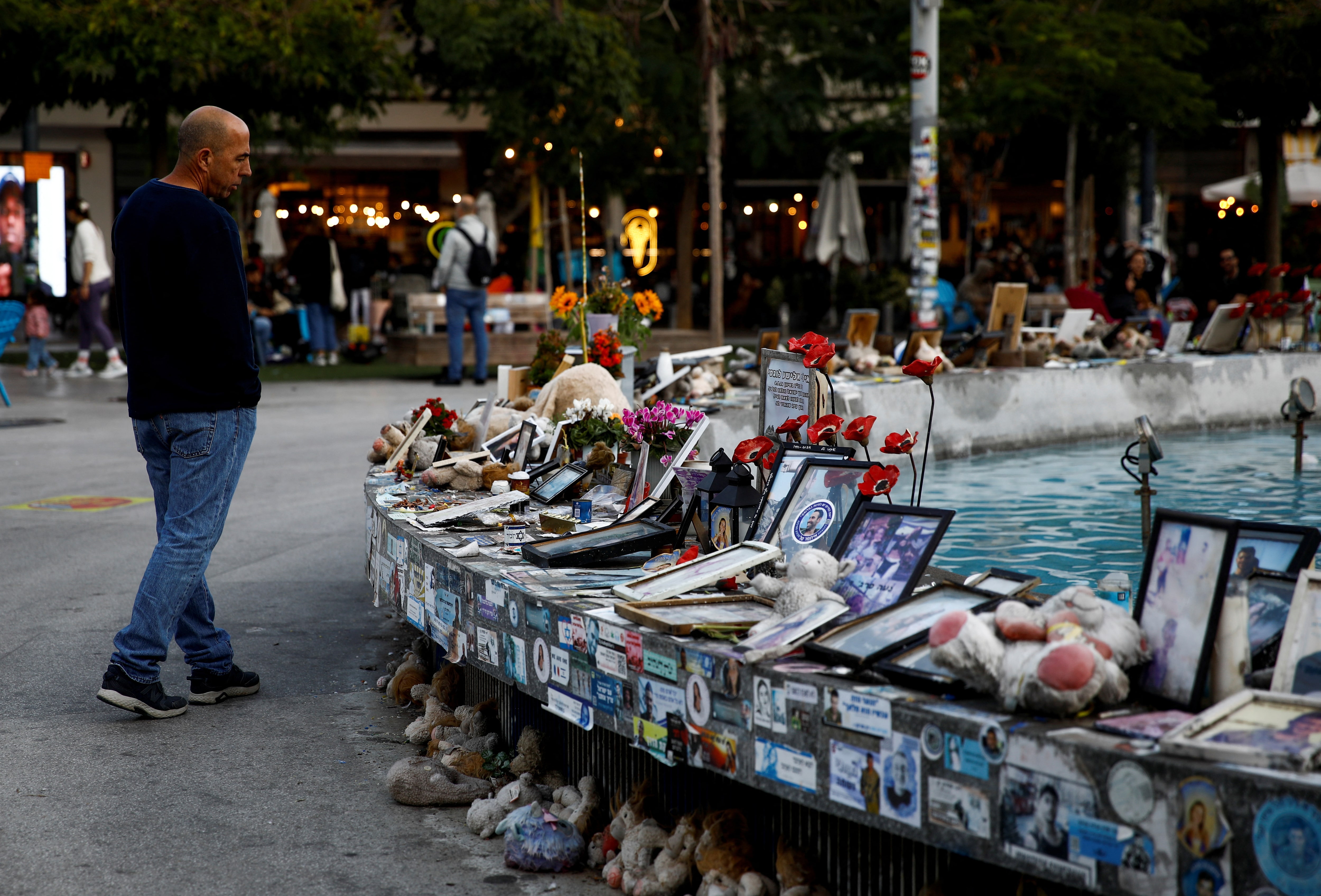 一名男子在特拉维夫的一个公共广场上观看与在2023年10月7日哈马斯袭击中遇难的士兵、被绑架者和遇害者相关的照片和纪念品,正值以色列与哈马斯之间的停火前夕,时间是2025年1月16日。路透社/希尔·托雷姆/档案照片开罗/特拉维夫,1月20日(路透社) - 哈马斯周一表示,将于周六释放在加沙被拘留的下一批人质,此前一名巴勒斯坦武装组织的官员曾表示,他们的释放将比预期晚一天。
