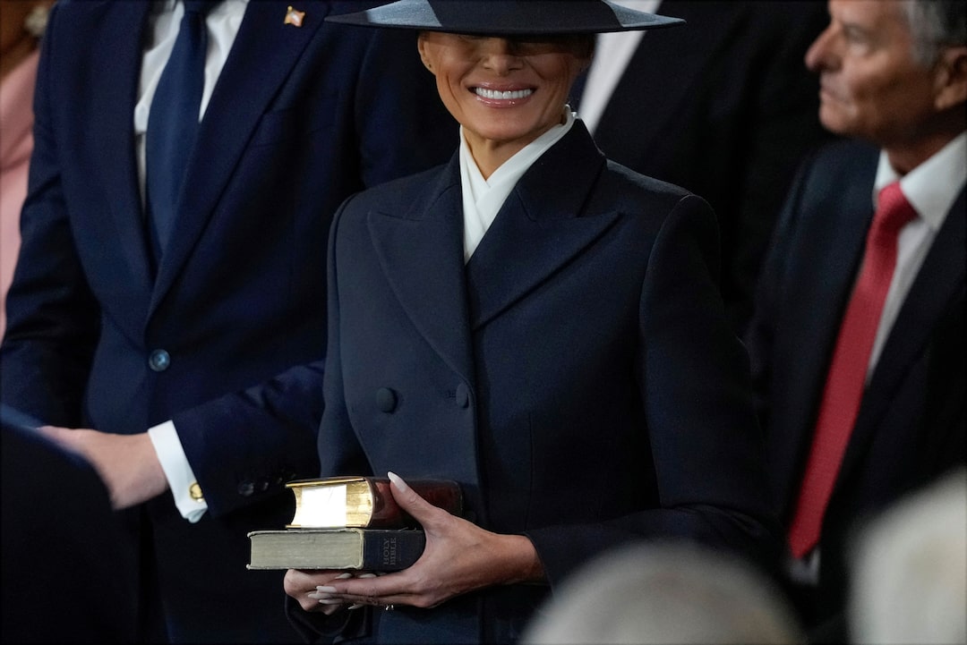 唐纳德·特朗普在美国首席大法官约翰·罗伯茨的宣誓下成为美国第47任总统,梅拉尼娅·特朗普在2025年1月20日星期一的美国国会大厦圆形大厅举行的第60届总统就职典礼上手持圣经。莫里·盖什/池 via 路透社