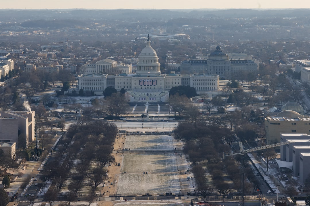 第1项,共2项 从华盛顿纪念碑顶部俯瞰美国国会大厦,拍摄于唐纳德·特朗普第二个总统任期的就职日,地点:美国华盛顿特区,2025年1月20日。路透社/布伦丹·麦克德米德/池