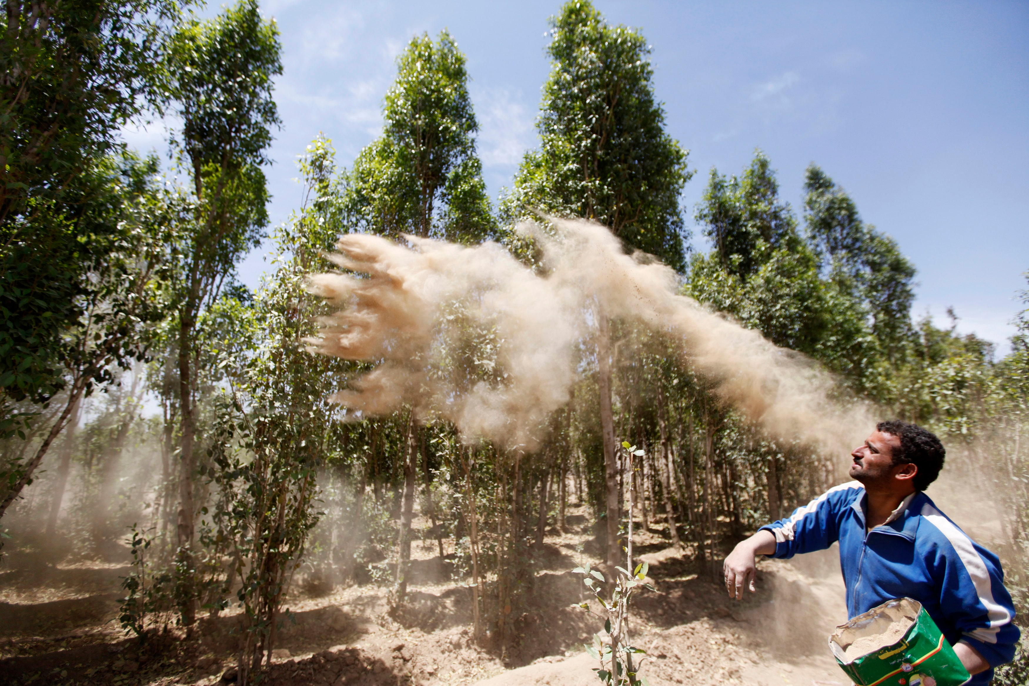 一个男人在他的农场上向卡特叶子撒施肥土,照片来自路透社档案。亚丁 1月21日(路透社)- 在也门气温下降和霜冻潮的影响下,农业作物受到影响,这个国家因战争而在经济和社会上苦苦挣扎多年,尤其是最近价格上涨超过200%的麻醉性植物卡特。