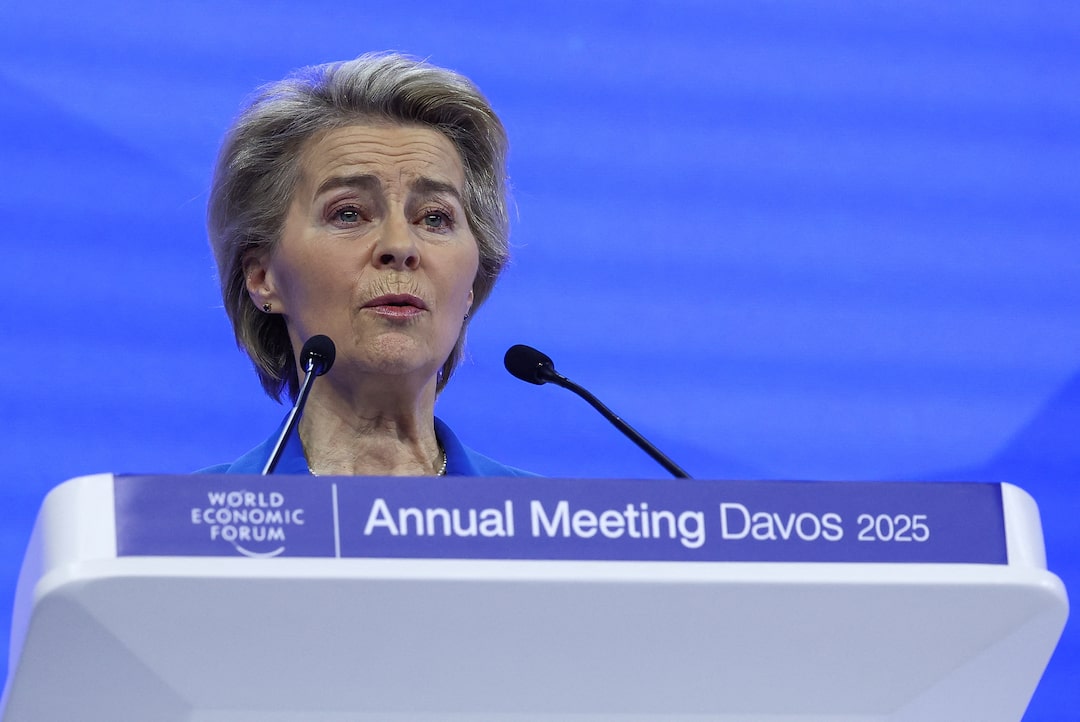 欧洲委员会主席乌尔苏拉·冯·德莱恩在2025年1月21日瑞士达沃斯举行的第55届世界经济论坛(WEF)年会上发表特别讲话。路透社/伊夫·赫尔曼