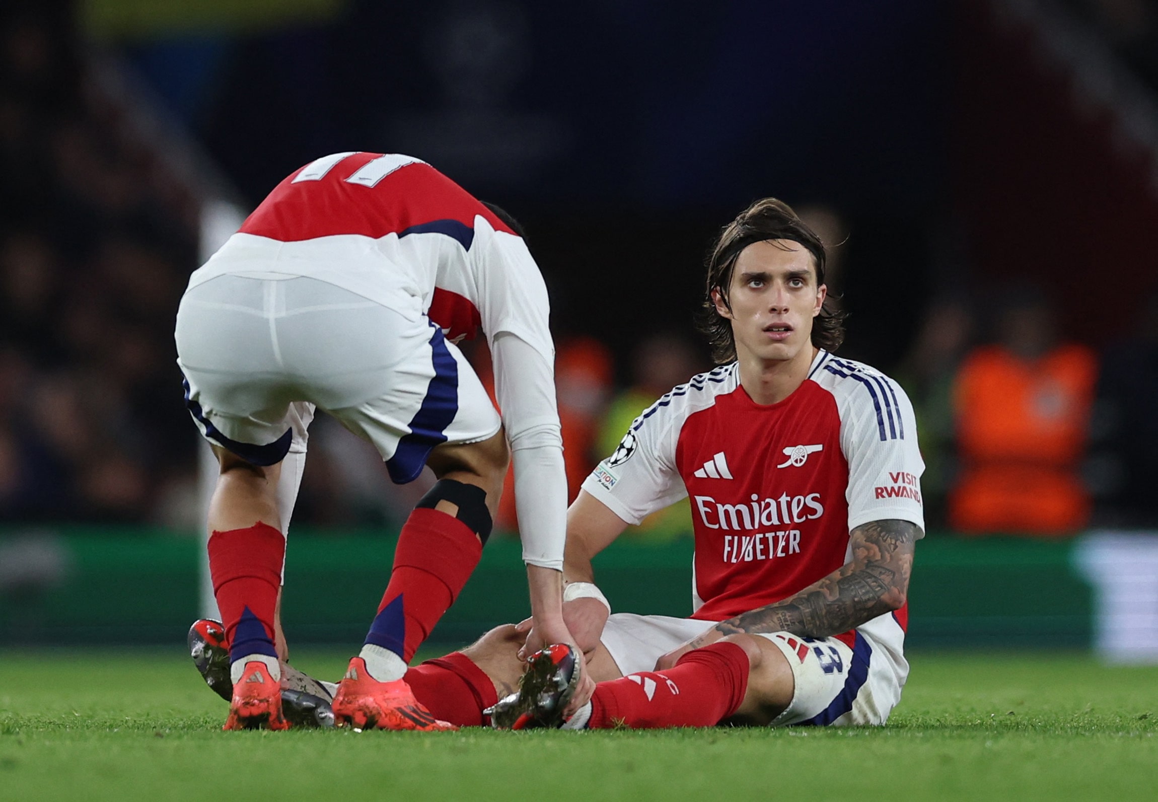 后卫里卡多·卡拉菲奥里在2024年10月22日的欧洲冠军联赛比赛中受伤。摄影:保罗·查尔兹 - 路透社2024年1月21日(阿拉伯路透社体育服务) - 阿森纳主教练米克尔·阿尔特塔表示,随着受伤的后卫里卡多·卡拉菲奥里和中场伊桑·努瓦内里回归,球队获得了士气上的提升,球队正准备在周三迎战迪纳摩·萨格勒布,恢复他们在欧洲冠军联赛的征程。