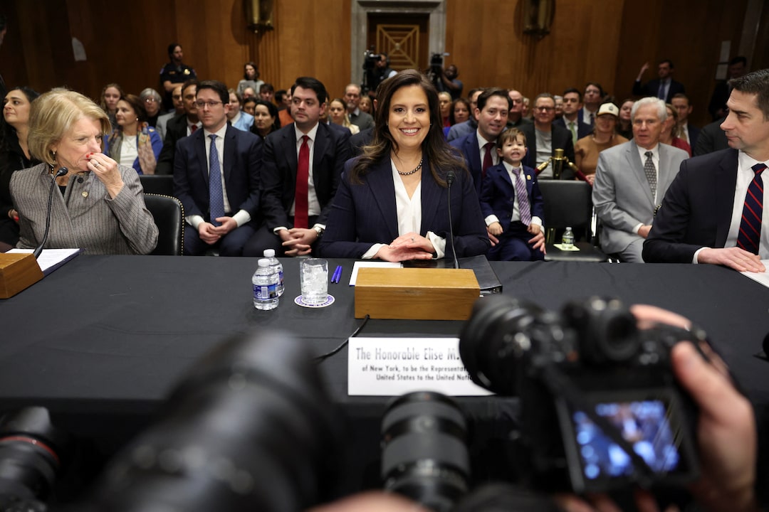第1项,共2项 美国众议员埃莉斯·斯特凡尼克(R-NY),美国总统唐纳德·特朗普提名的联合国大使,在2025年1月21日于美国华盛顿国会山举行的参议院外交关系委员会确认听证会上作证。路透社/埃夫琳·霍克斯坦