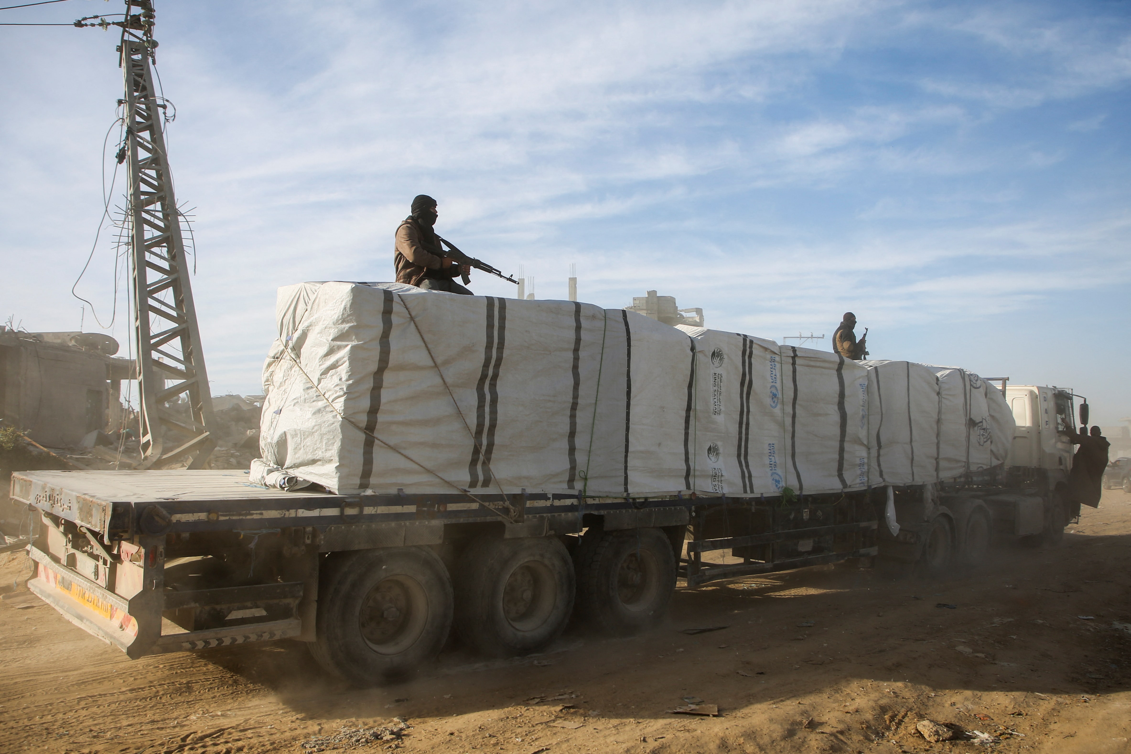 两名武装的巴勒斯坦人保护一辆装载着援助物资的卡车,此时以色列与哈马斯之间的停火协议正在生效,地点在加沙地带南部的拉法,时间为2025年1月20日。摄影:哈特姆·哈立德 - 路透社2025年1月22日(路透社) - 联合国人道主义事务协调办公室表示,今天星期三,共有808辆援助卡车进入加沙地带,这是以色列与巴勒斯坦伊斯兰抵抗运动(哈马斯)停火协议生效的第四天。