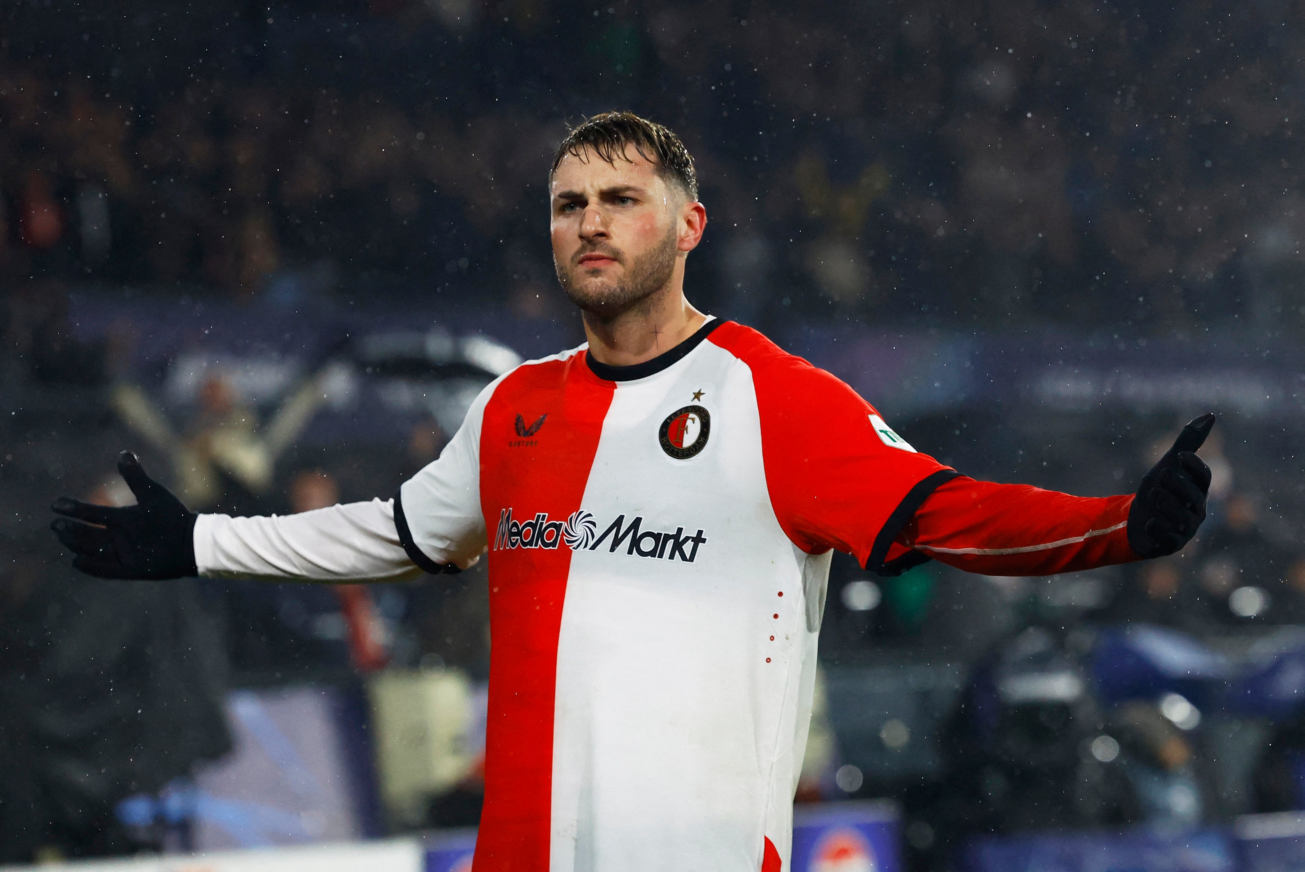 圣地亚哥·希门尼斯,费耶诺德前锋,在2025年1月22日的欧洲冠军联赛中,庆祝为球队打入第二个进球,比赛在鹿特丹进行。摄影:佩鲁什卡·范·德·法乌 - 路透社鹿特丹(荷兰)2025年1月22日(阿拉伯路透社体育服务) - 圣地亚哥·希门尼斯,费耶诺德前锋,在上半场打入两个进球,帮助荷兰球队以3-0战胜来访的拜仁慕尼黑,增强了他们在下周最后一轮比赛前进入前八名的机会。