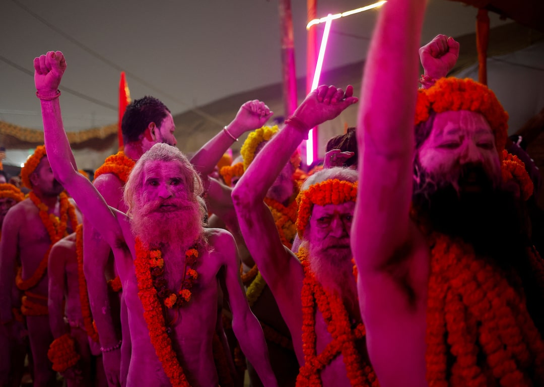 三位中的第一位,纳迦圣人或印度教圣人,在印度普拉亚格拉杰的“马哈库姆梅拉”或“大水壶节”期间,喊着宗教口号,准备下水,2025年1月14日。路透社/阿德南·阿比迪/档案照片