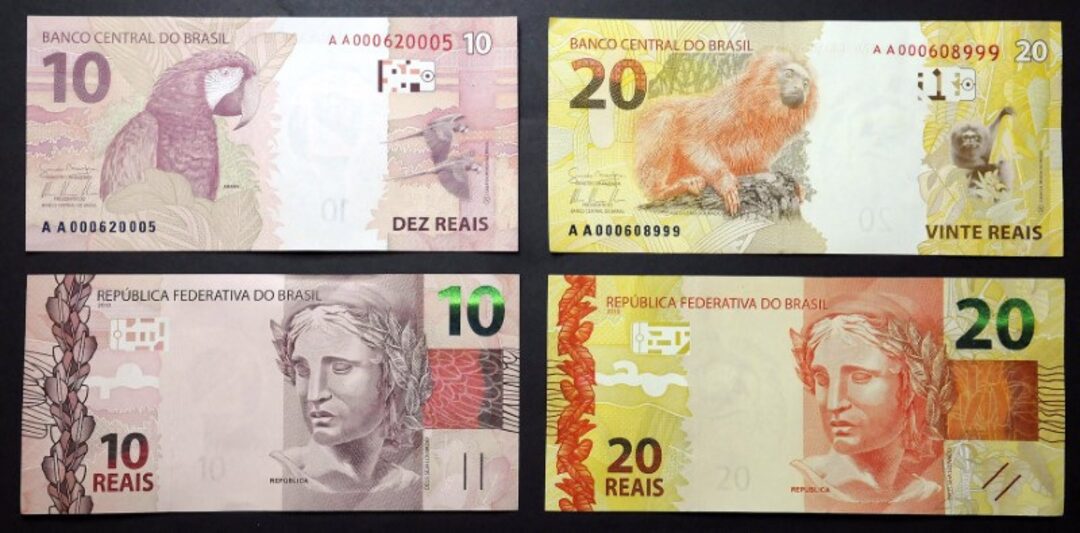 第1项,共2项 归档照片。巴西的20和10雷亚尔纸币在巴西利亚的巴西中央银行展出,日期为2012年7月23日。路透社/Cadu Gomes