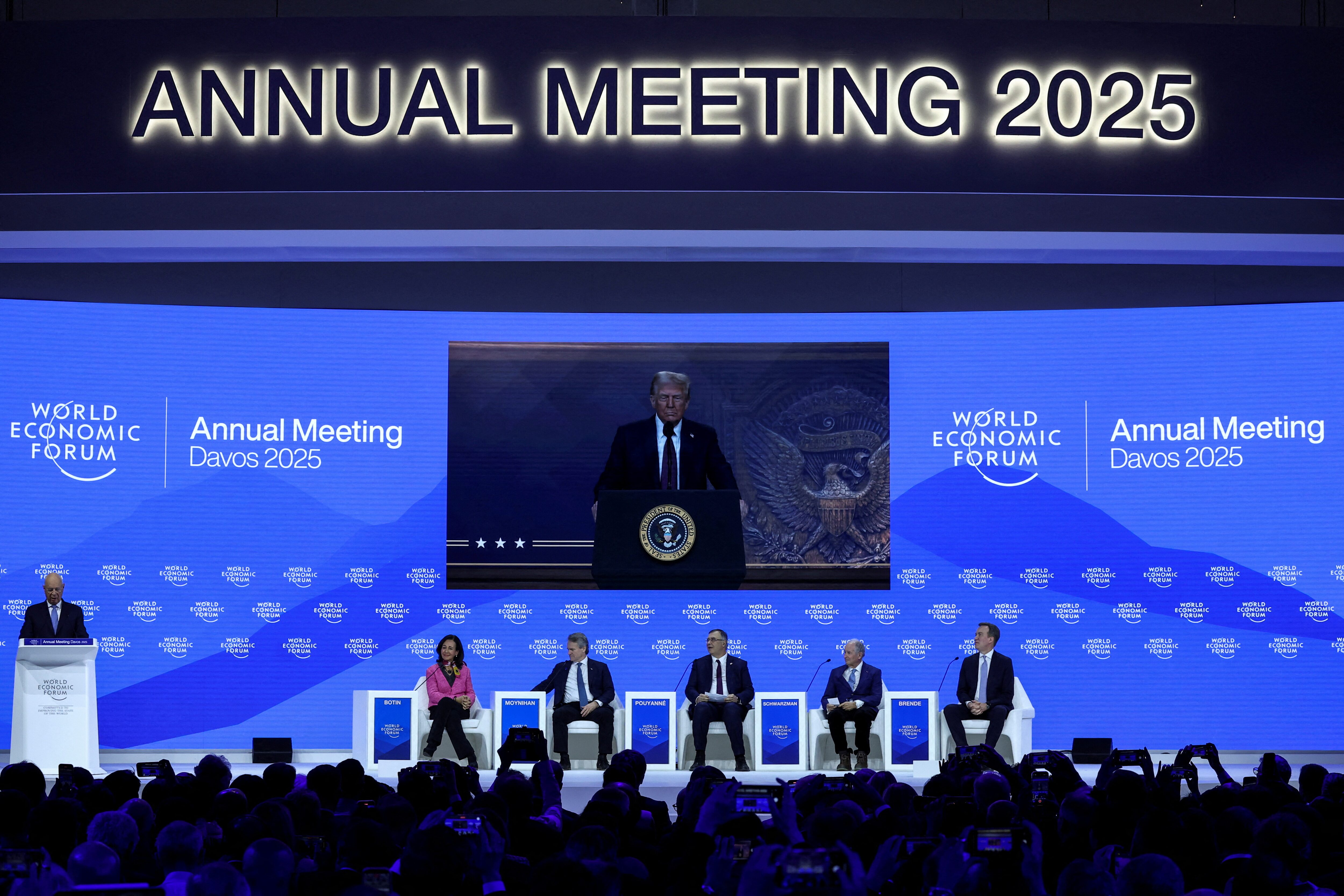 商业领袖包括美国银行的首席执行官 (BAC.N),布莱恩·莫伊尼汉,以及黑石集团的首席执行官 (BX.N),斯蒂芬·施瓦茨曼,以及道达尔能源的首席执行官 (TTEF.PA),帕特里克·普扬,世界经济论坛的首席执行官博尔格·布伦德,以及世界经济论坛的创始人克劳斯·施瓦布。来自世界各地的超过一千名高管、官员和其他人士涌入大会的主会场,参加特朗普的演讲,包括波兰总统安杰伊·杜达。