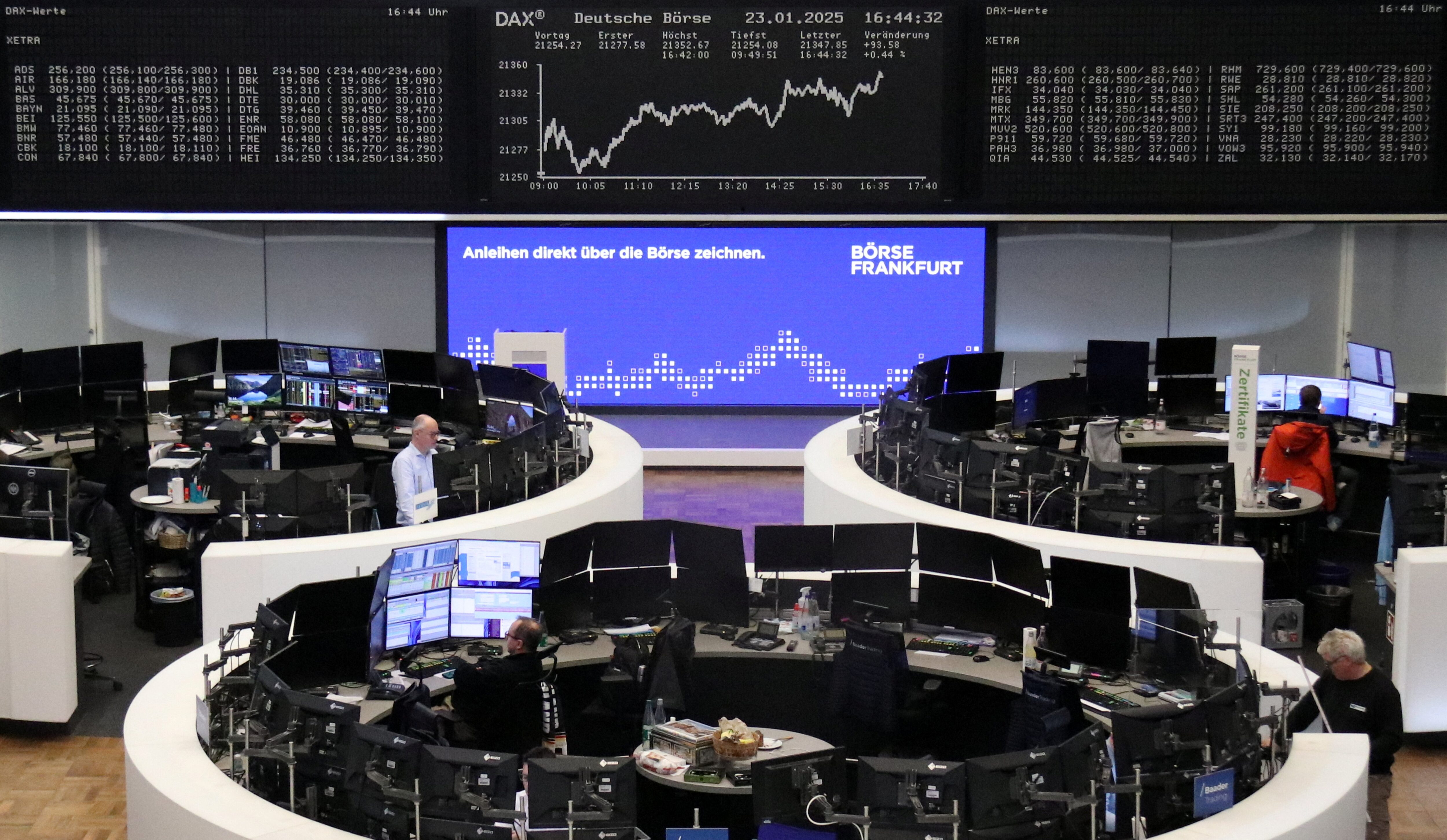 电子屏幕显示2025年1月23日在法兰克福证券交易所上市的德国DAX指数的股票数据 - 路透社。2025年1月23日(路透社) - 欧洲股市周四收高,受到美国总统唐纳德·特朗普在达沃斯世界经济论坛上的讲话支持,而大型科技公司的股价下跌限制了涨幅。