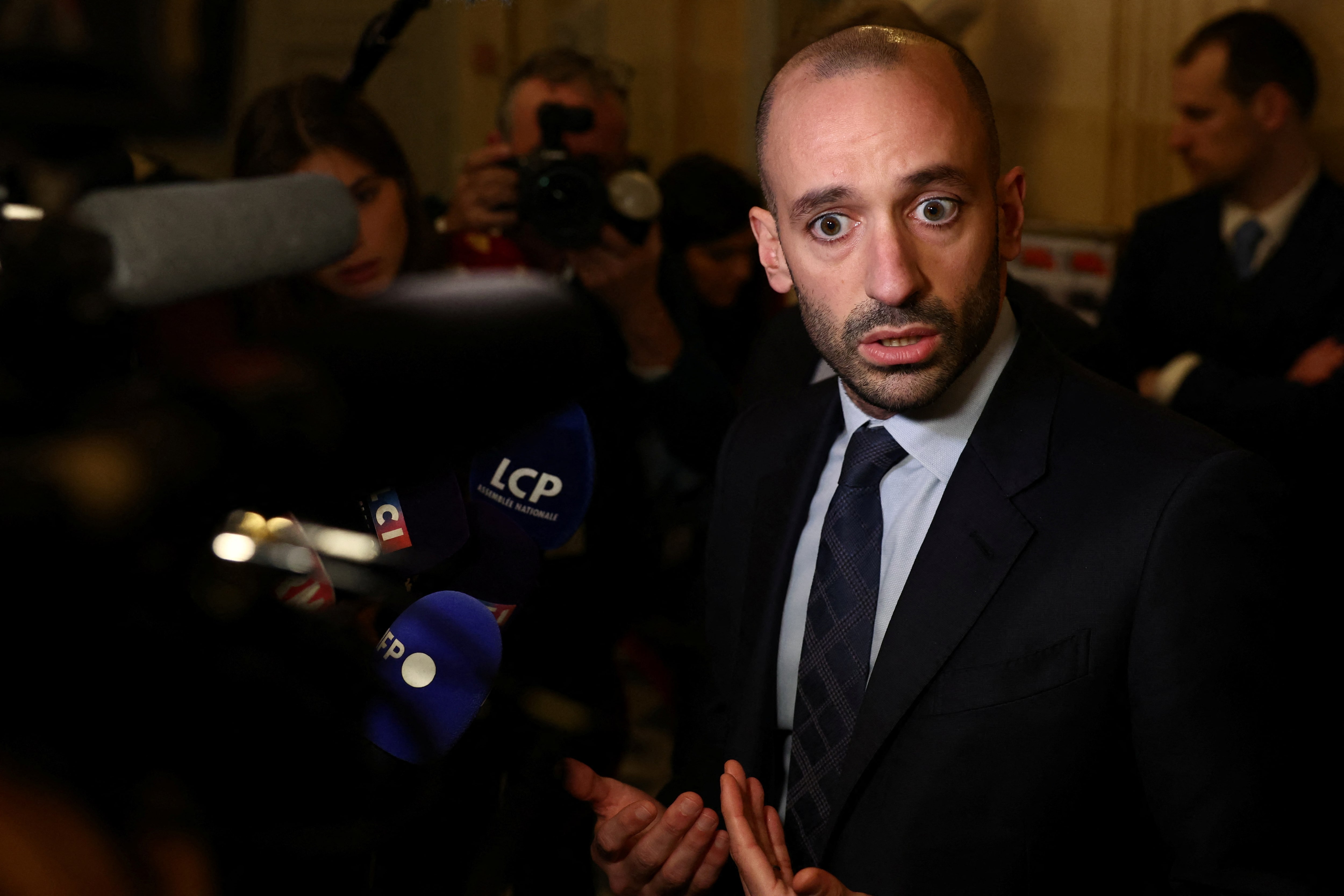 档案照片-政治党复兴的议员本杰明·哈达德在法国巴黎的国民议会与记者交谈,国民议会通过了一项动议以驳回移民法案。2023年12月11日。路透社/斯蒂芬妮·勒科克巴黎,1月24日(路透社)-法国正在推动减少欧盟的官僚主义,呼吁对欧盟的新规进行“重大休整”,推迟要求企业报告其环境足迹的法规,并对新通过的法律进行修改。