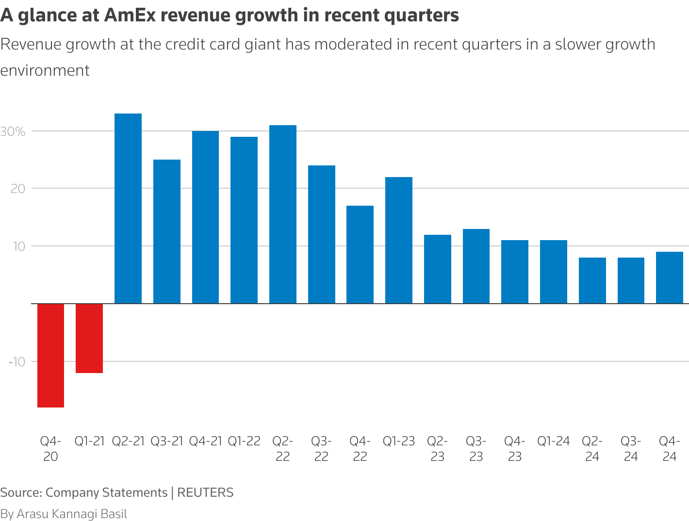 美国运通预计2025年的每股收益在15到15.50美元之间,而预期为15.23美元。公司预计收入增长在8%到10%之间,而预期为8.1%。