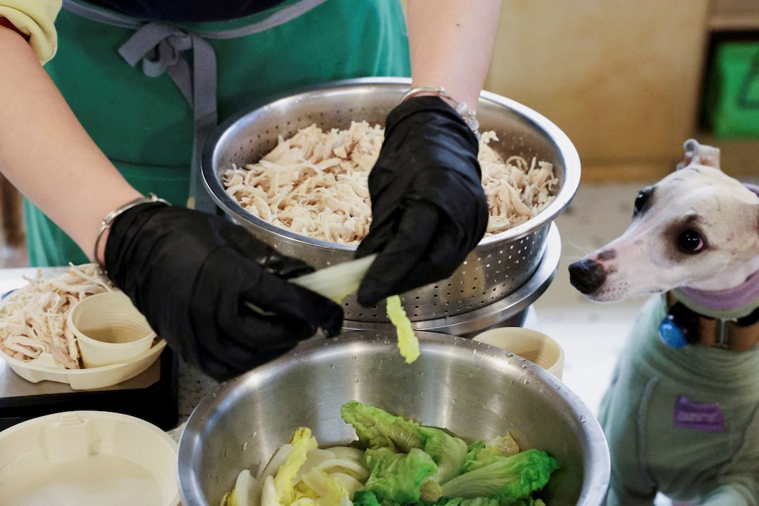当他们的主人享用蘑菇鸡肉炖菜时,他们的狗则享用新鲜准备的 shredded 鸡胸肉、煮熟的生菜和狗零食。