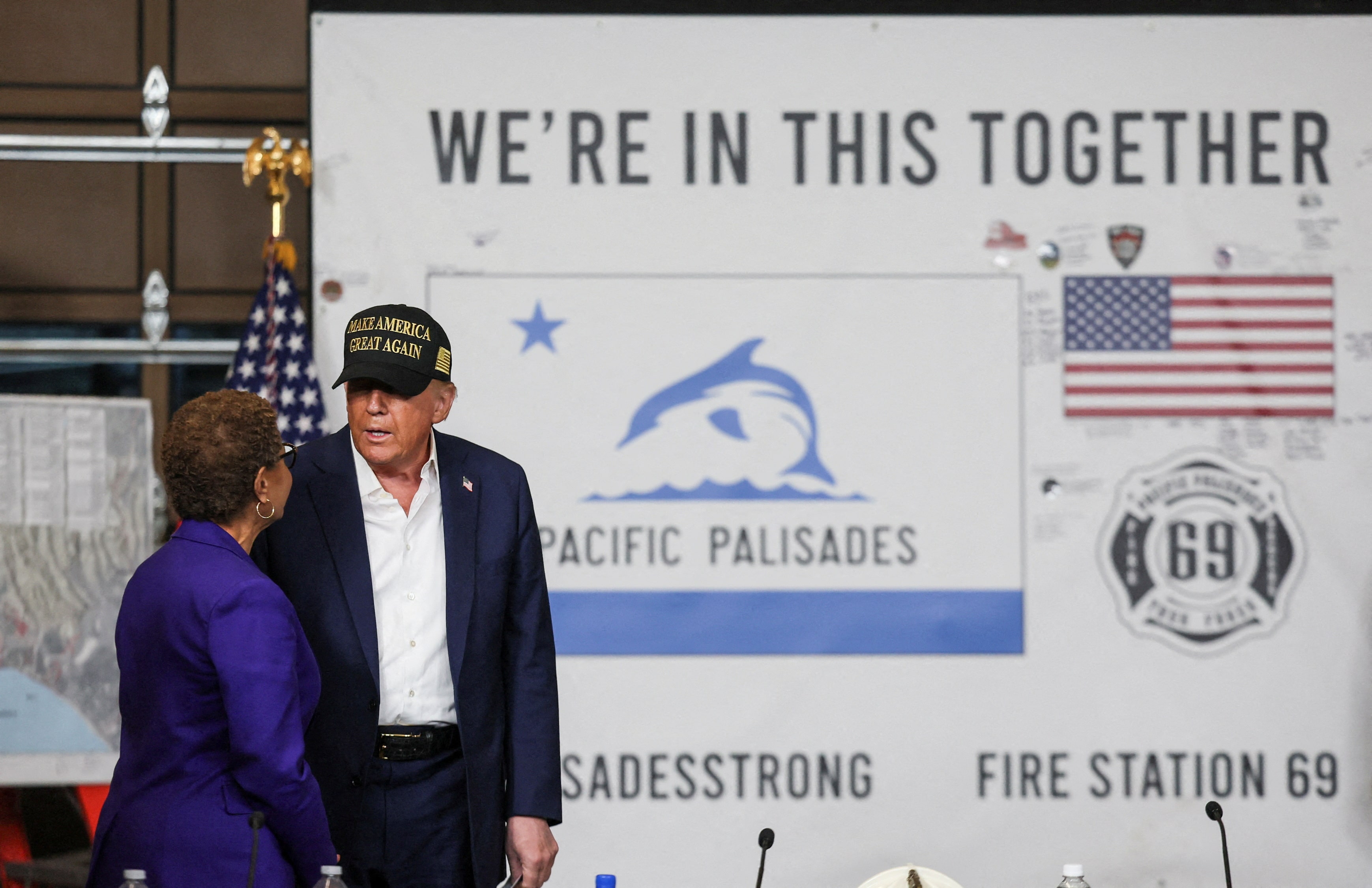 美国总统唐纳德·特朗普在加利福尼亚州洛杉矶的太平洋帕利塞德社区进行野火损害简报时,与洛杉矶市长卡伦·巴斯交谈,该地区因帕利塞德火灾而受到损害,时间是2025年1月24日。路透社/利亚·米利斯华盛顿,1月26日 - 美国总统唐纳德·特朗普在周日发布了一项行政命令,指示联邦政府在发现加利福尼亚州的水管理措施无效时,覆盖该州的水管理做法。该命令是在特朗普访问了遭受一系列野火摧毁的洛杉矶地区两天后发布的。特朗普错误地声称,民主党州长加文·纽瑟姆和其他官员拒绝提供来自该州北部的水源来扑灭火灾。