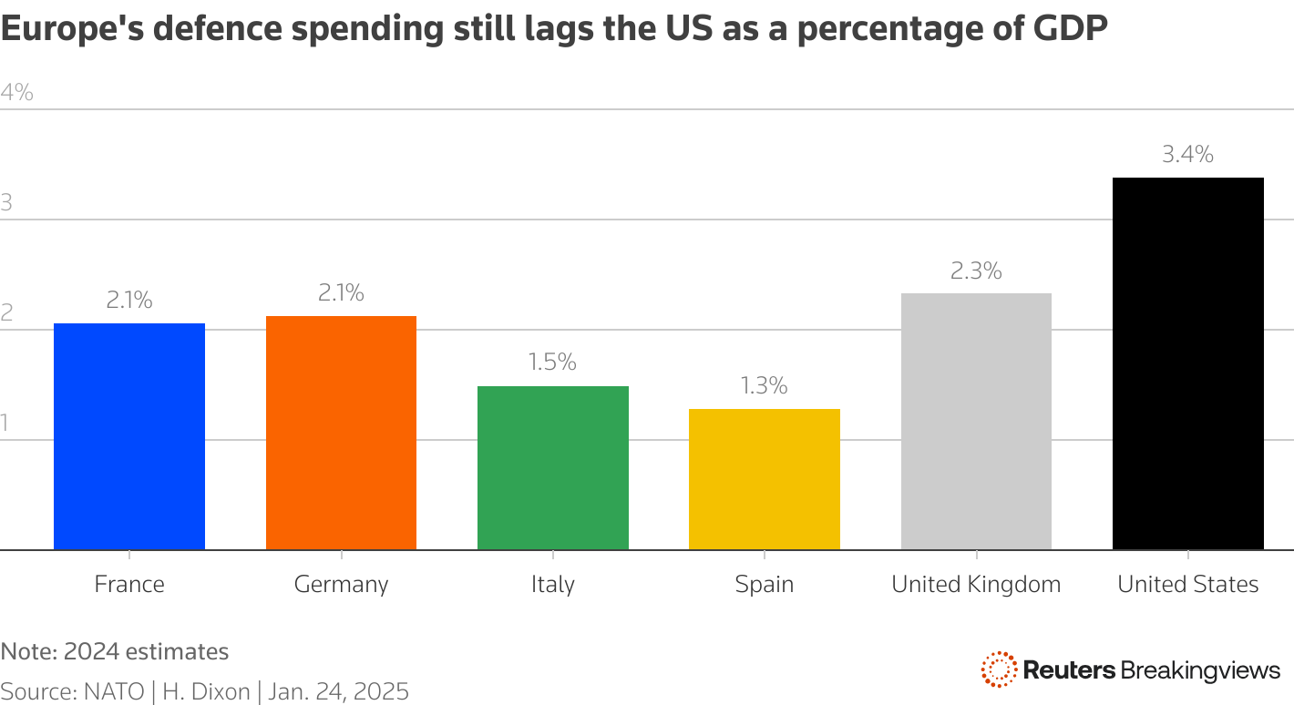 美国总统唐纳德·特朗普在2025年1月20日美国华盛顿白宫椭圆形办公室签署文件的当天发表讲话。路透社/卡洛斯·巴里亚伦敦,1月27日(路透社Breakingviews) - 如果欧洲强大,它可以对唐纳德·特朗普的任何欺凌行为进行强有力的反击。布鲁塞尔和英国将能够用对美国进口商品的税收来抵消任何关税。他们可以对碳密集型贸易征收额外关税,以惩罚新任美国总统因为退出巴黎气候变化协议。在那种情况下,欧洲可能会对美国跨国公司征税,因为特朗普取消了一项全球协议,该协议设定了最低企业税。它可能会对那些滥用权力操控市场或干涉欧洲政治的大型科技公司处以罚款。欧洲甚至可能在贸易和绿色能源方面与中国找到共同利益,甚至可能联合对抗美国。做梦吧。欧洲在经济和军事上都很弱。德国和法国的领导人,奥拉夫·肖尔茨和埃马纽埃尔·马克龙,都是跛脚鸭——而该地区越来越强大的极右翼民粹主义政治家们反对欧洲团结。