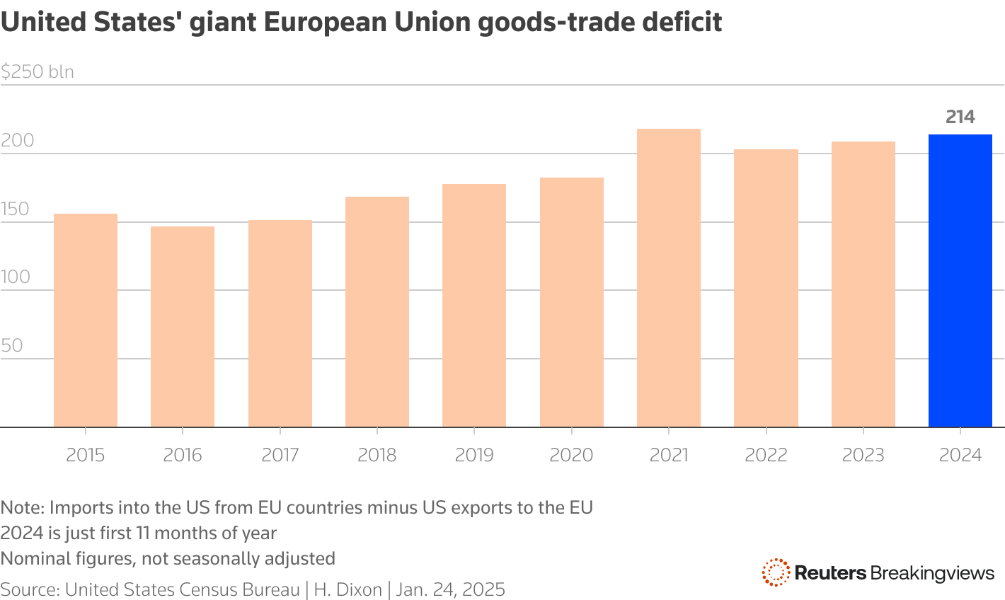 条形图显示美国与欧盟贸易赤字的上升,2016年最低为1470亿美元,2024年前11个月达到2140亿美元