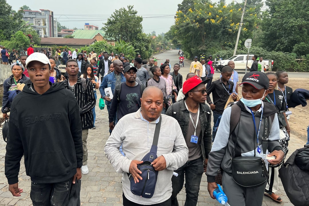 人道主义工作人员在2025年1月27日,在卢旺达基森yi,因M23叛军与刚果民主共和国(FARDC)武装部队之间的冲突而逃离东刚果的戈马。路透社/记者 巴黎,1月27日(路透社) - 刚果民主共和国和卢旺达的部队在东刚果城市戈马的共同边界上互相开火,卢旺达支持的叛军发起了攻势,两名联合国消息人士周一表示。