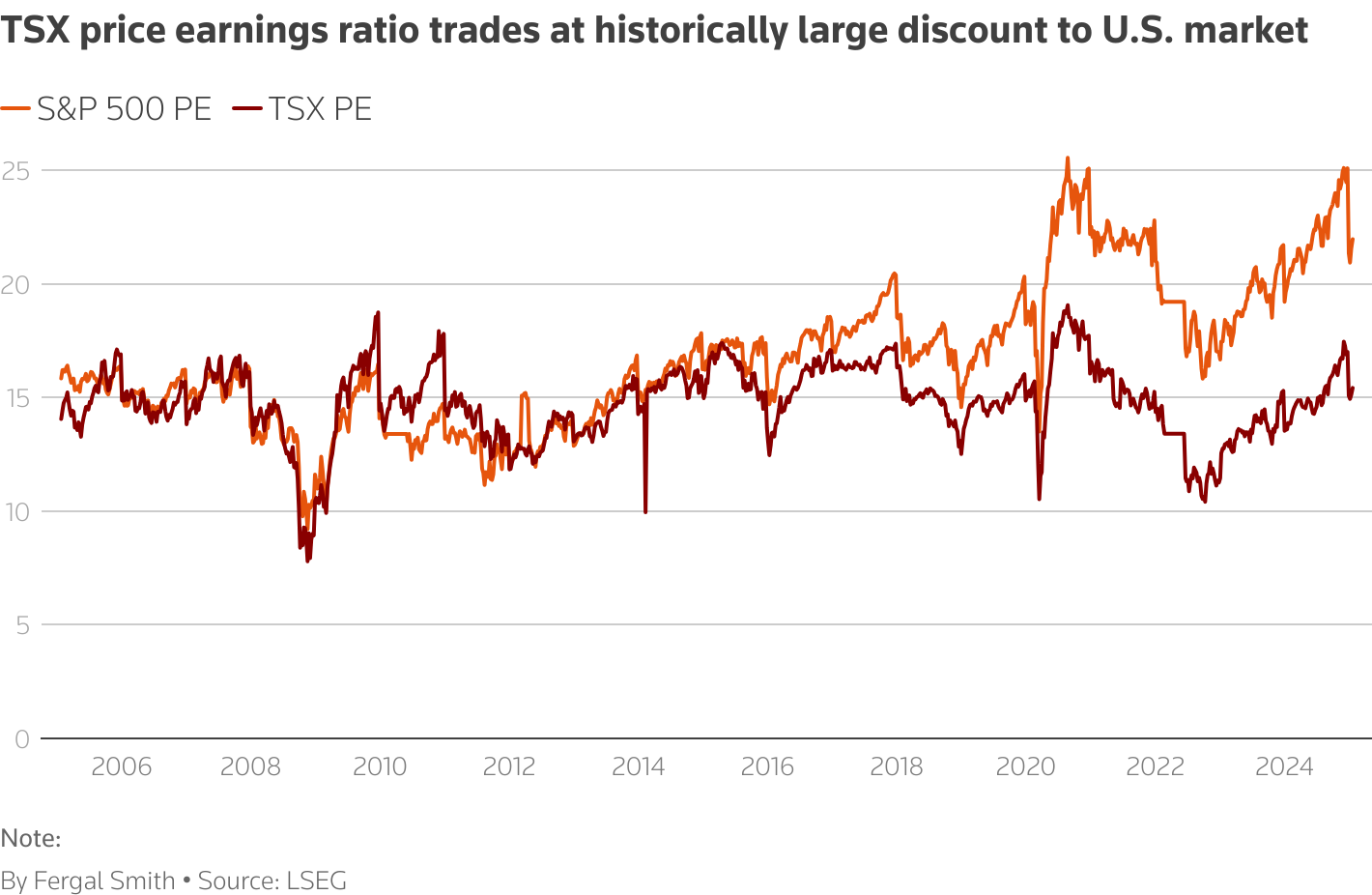 图表显示,标准普尔500指数的市盈率在近年来进一步高于多伦多证券交易所的倍数。
