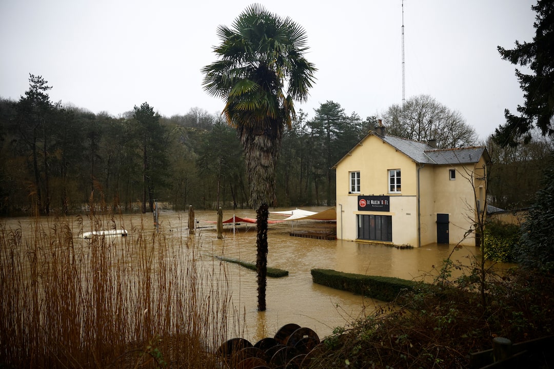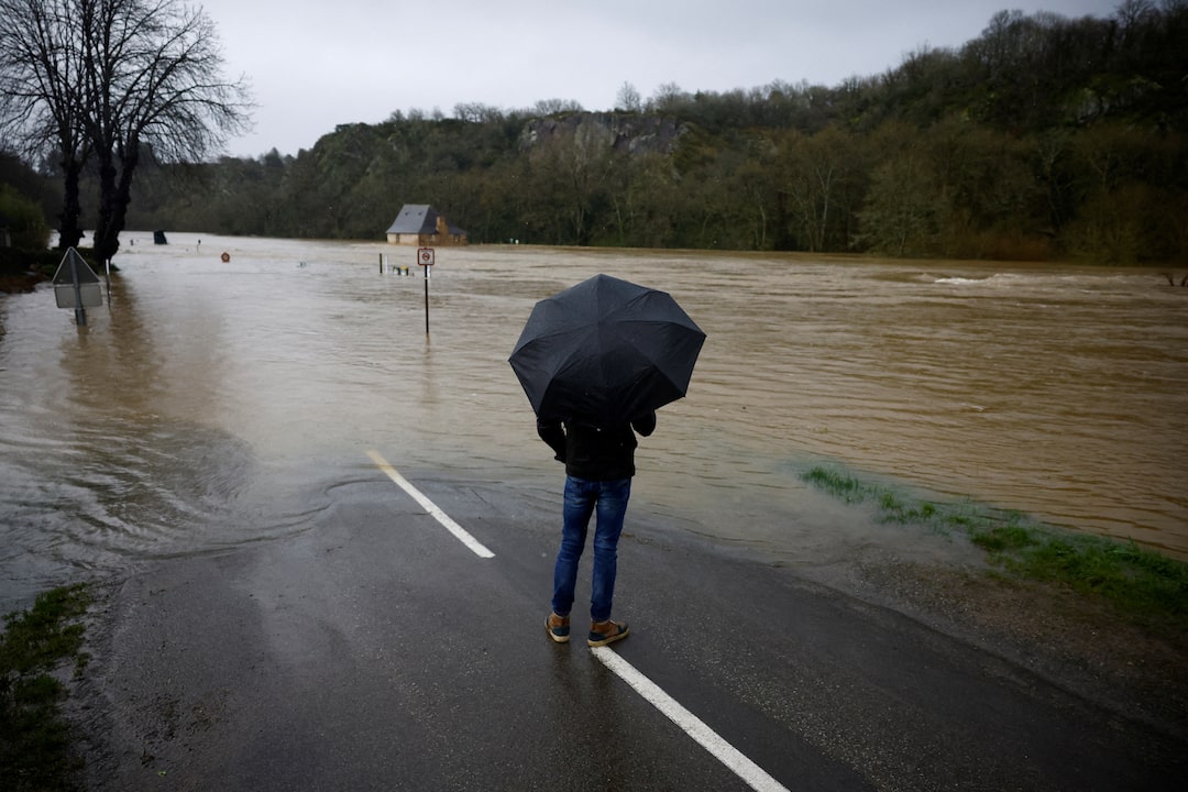 5张中的第1张 一名居民在伞下观察位于雷恩附近的吉希昂被淹没的区域,因为维莱讷河在经历几天的强降雨后溢出,造成洪水,风暴赫尔米尼亚袭击法国西部。