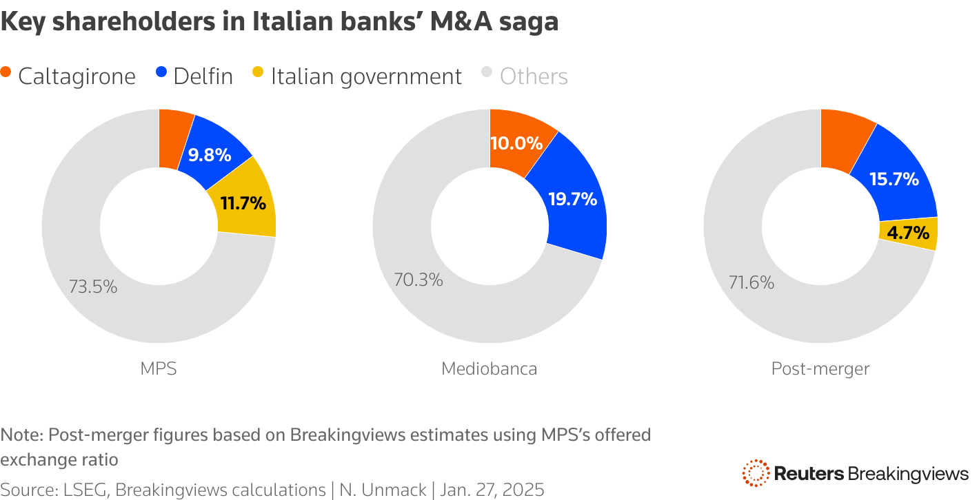 伦敦,1月27日(路透社Breakingviews) - 有时候,赢得一场战斗的最佳方式是让攻击者独自作战。Mediobanca的首席执行官(MDBI.MI)阿尔贝托·纳盖尔可能会对蒙特·德伊·帕斯基·迪·西耶纳(Mps)(BMPS.MI)采取这种策略,该银行周五对位于皮亚泽塔·库基亚的更大规模银行发起了130亿欧元的收购要约。典型的防御性选项似乎很复杂,但对并购持怀疑态度的投资者可能是纳盖尔的盟友。长期担任Mediobanca首席的纳盖尔面临困境。Mps的收购,理论上看似不切实际,市值为80亿欧元。然而,弗朗切斯科·加埃塔诺·卡尔塔吉罗内和德尔·维基奥家族的控股公司德尔芬在这两个集团中持有重要股份,并似乎已经祝福了这项将纳盖尔束缚的交易。