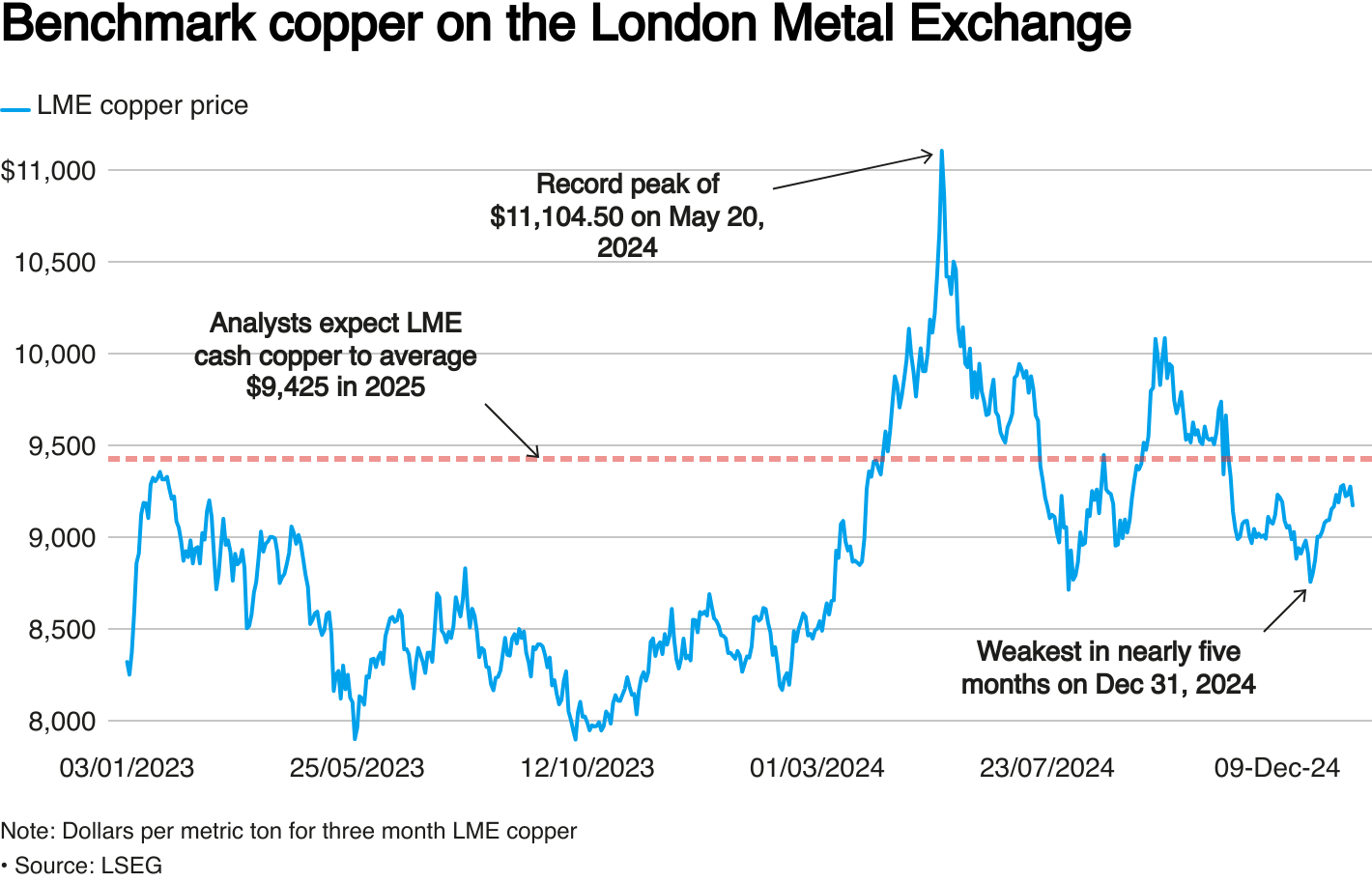伦敦/班加罗尔,1月27日(路透社) - 分析师们已下调了对2025年铜价的预期,原因是对美国总统唐纳德·特朗普的政策、中国作为主要金属消费国的经济状况以及通货膨胀的担忧,依据路透社的一项调查。
