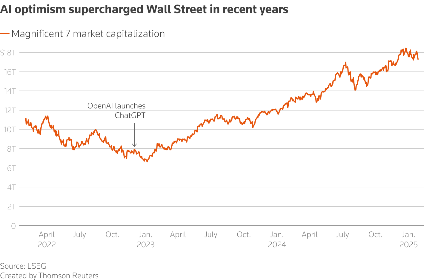这种商业需求推动了自2022年11月 ChatGPT 引发人工智能热潮以来,“七大奇迹”公司市值增加约10万亿美元。