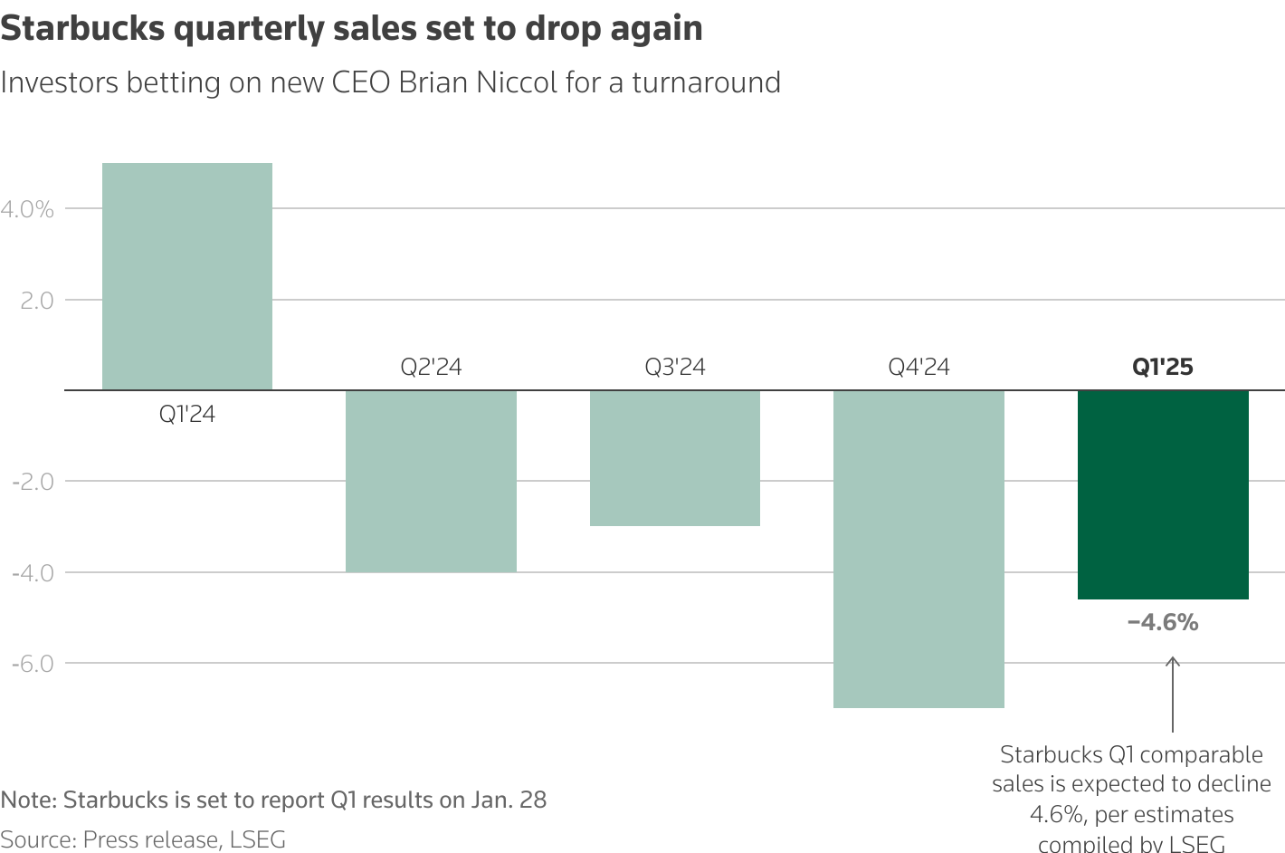 1月27日(路透社)- 一家星巴克(SBUX.O)将在周二报告其连续第四个季度的可比销售下滑,这可能是对投资者的又一次打击,他们期待新任首席执行官布莱恩·尼科尔(Brian Niccol)采取措施恢复咖啡连锁店的需求。尼科尔在星巴克的新职位上已经四个月,他制定了一系列措施来改善该连锁店的业务,该业务受到竞争加剧和美国及中国需求减弱的影响。