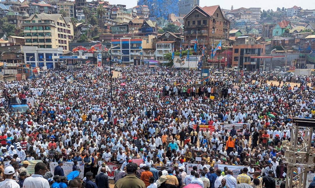三名刚果示威者参加了针对卢旺达的抗议活动,此次抗议是在刚果民主共和国(FARDC)武装部队与M23叛军在戈马发生冲突后,紧张局势加剧的情况下进行的;地点在刚果民主共和国东部的布卡武,时间为2025年1月27日。路透社/维克多·穆肯格