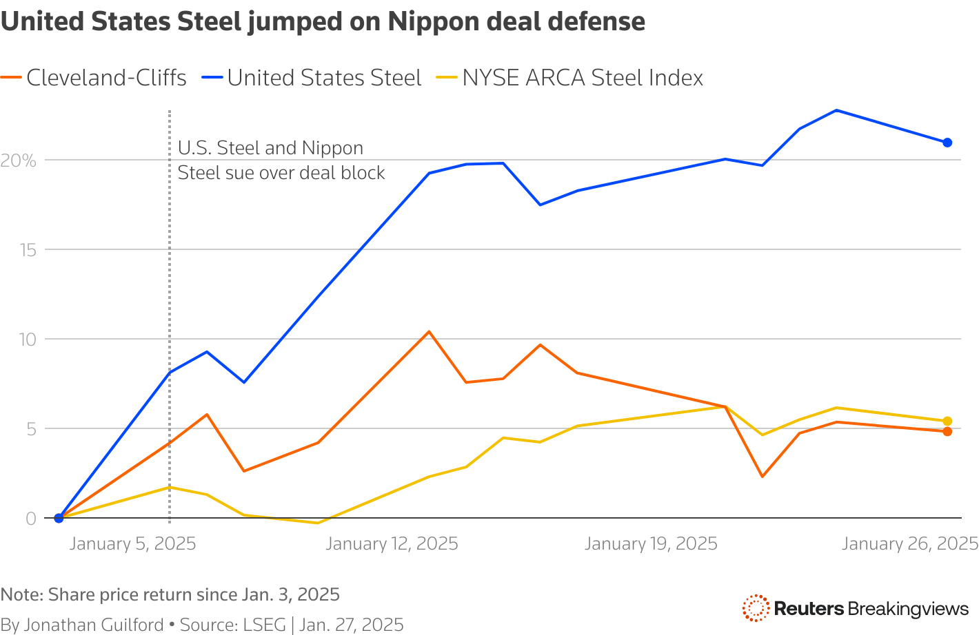 一次转机将是受欢迎的。根据Visible Alpha收集的估计,2025年EBITDA的前景持续下滑。然而,自从该公司起诉政府推翻日本公司的决定以来,其股价已上涨21%。目前股价约为37美元,低于日本公司的55美元报价,但远高于收购冲突开始前的交易价格。克利夫兰-悬崖公司和竞标合作伙伴纽柯 (NUE.N) 仅准备以“高30美元”每股的价格进行报价,CNBC 报道。
