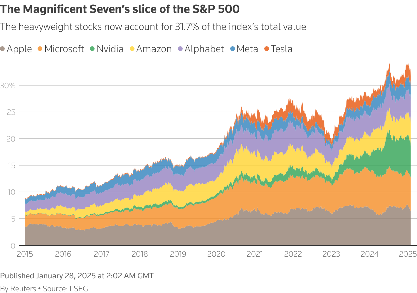 一张名为“七大巨头在标准普尔500中的份额”的区域图,跟踪该指标。