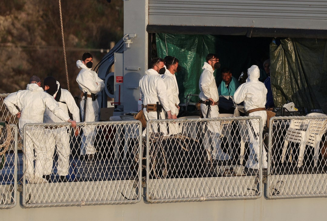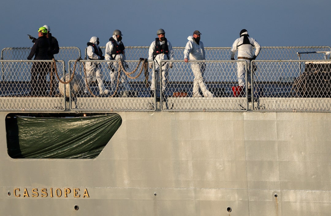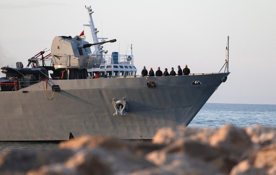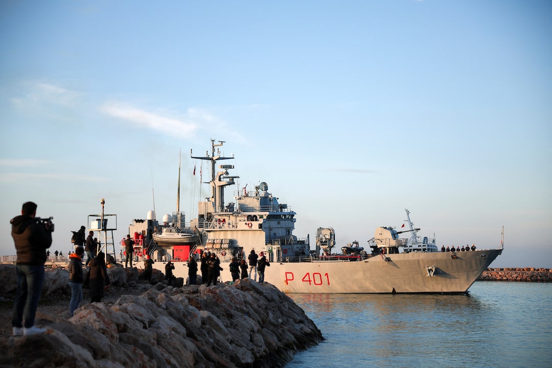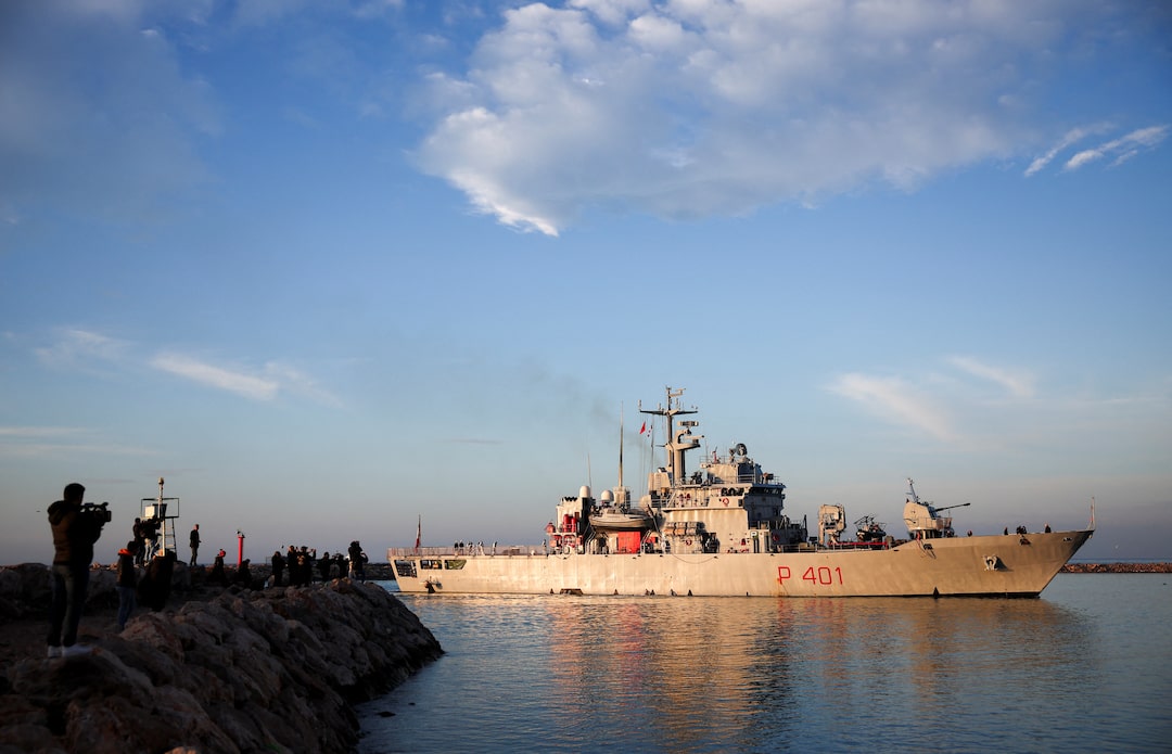 意大利海军舰艇卡西奥佩亚号的第1项,共5项,携带移民,作为与意大利达成的协议的一部分,以处理在意大利水域附近被捕获的数千名寻求庇护者,于2025年1月28日抵达阿尔巴尼亚的申金。路透社/弗洛里昂·戈加