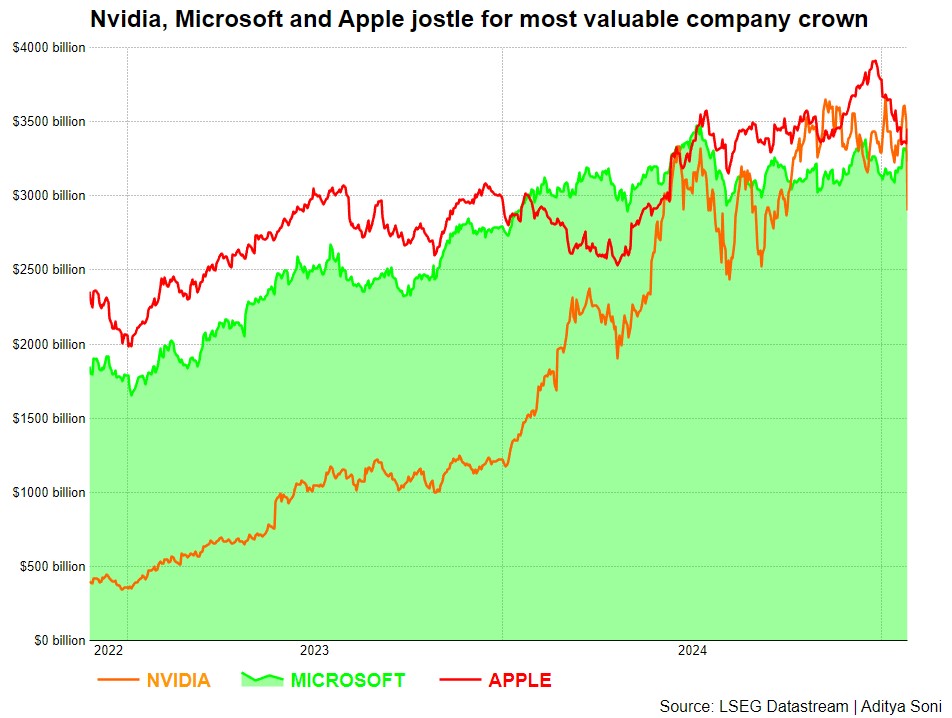 微软、苹果和英伟达争夺全球最有价值公司的桂冠