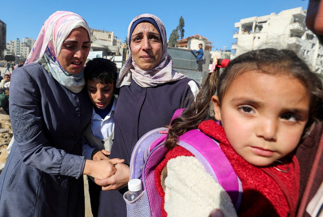 三名巴勒斯坦女性乌姆·阿里在战争期间被以色列命令迁移到南方后,回到加沙北部时拥抱她的女儿苏阿德·阿塔拉,正值以色列与哈马斯之间的停火,地点:加沙城,日期:2025年1月27日。路透社/达乌德·阿布·阿尔卡斯