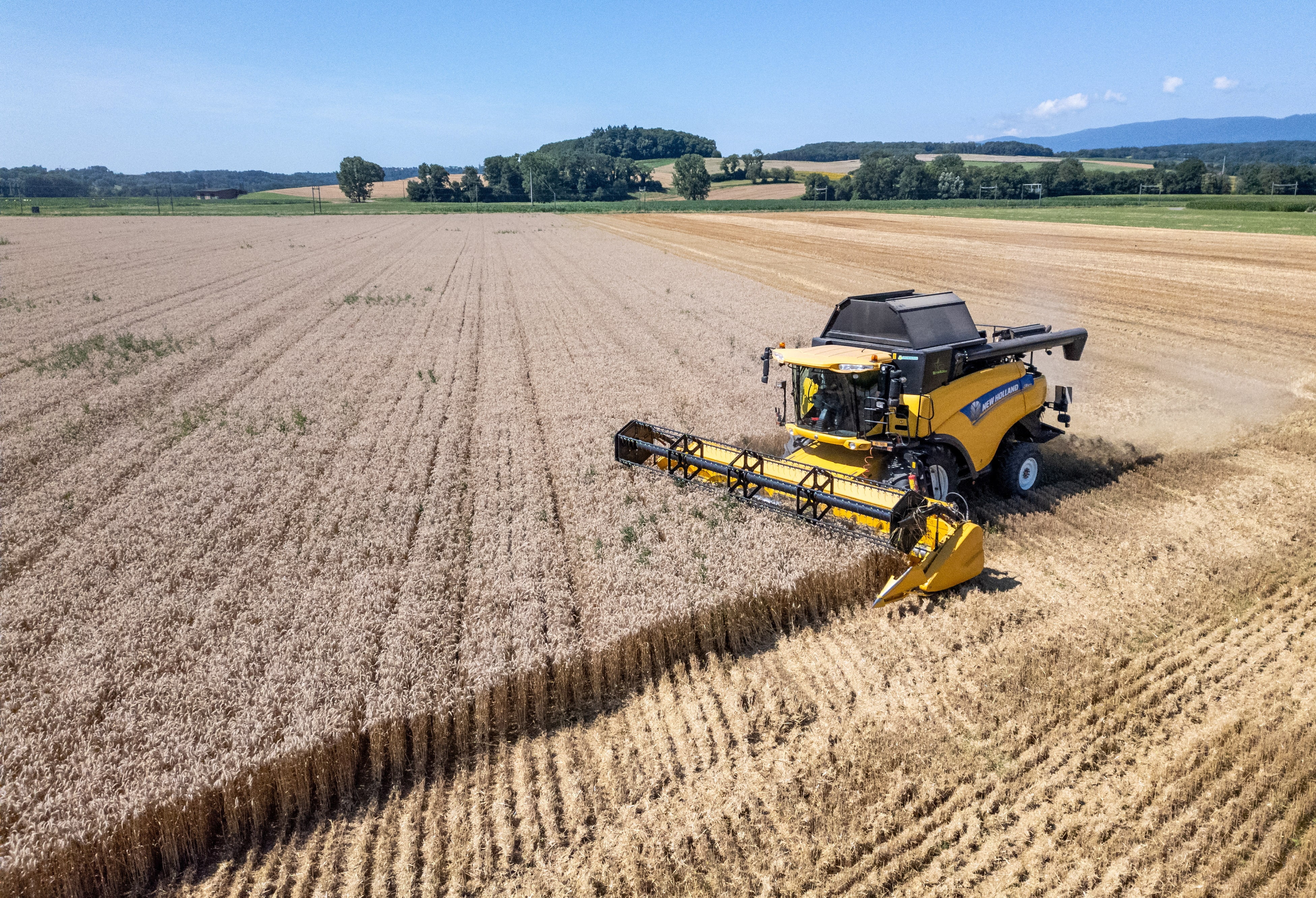 一幅航拍图显示一名农民在2024年7月25日于瑞士收割小麦。摄影:丹尼斯·巴利波斯 - 路透社汉堡 2024年1月28日(路透社) - 交易员表示,约旦的政府粮食买家在今天星期二的国际招标中购买了约5万吨优质小麦。