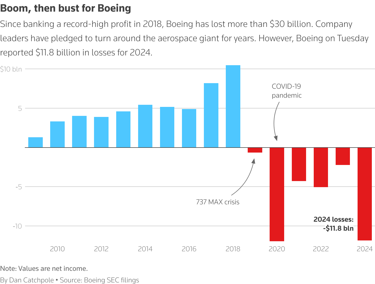 在2010年代获得创纪录的利润后,波音自2019年以来亏损超过300亿美元,此前其737 MAX喷气式飞机发生了两起致命事故,引发了对生产质量和安全的担忧,以及对其在飞机认证过程中是否欺骗监管机构的恐惧。