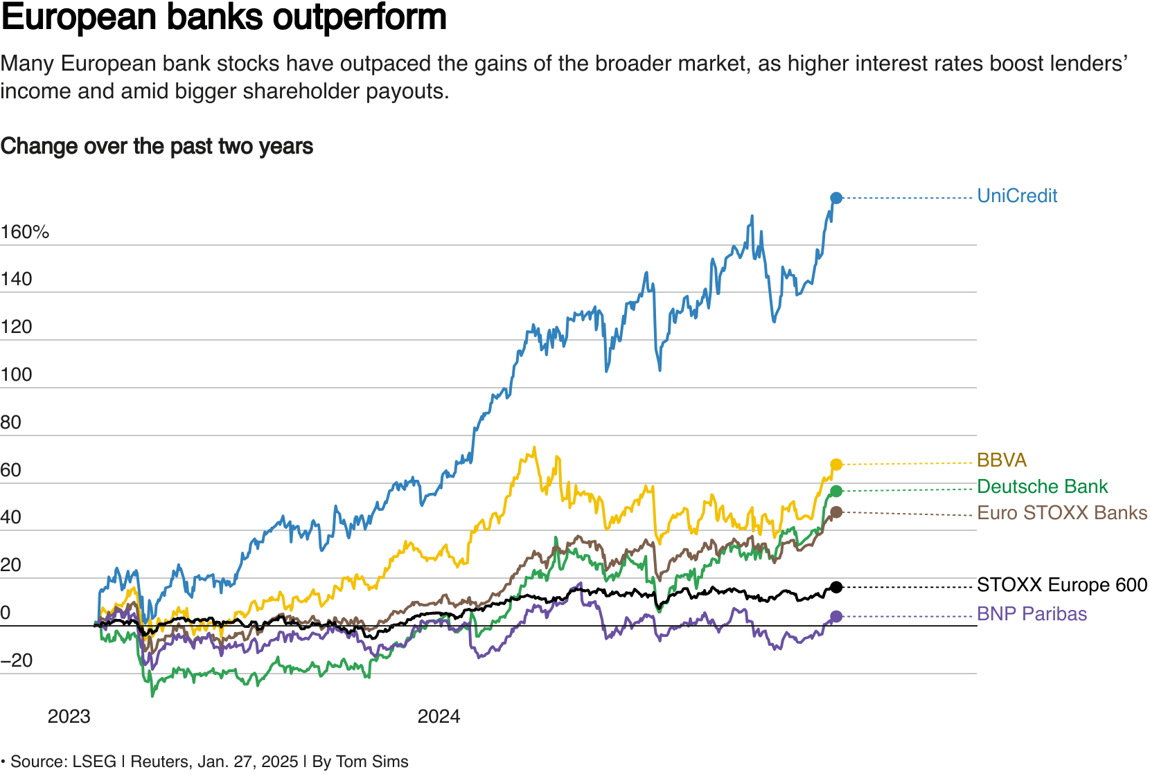 一条显示欧洲银行股票相对表现的折线图。