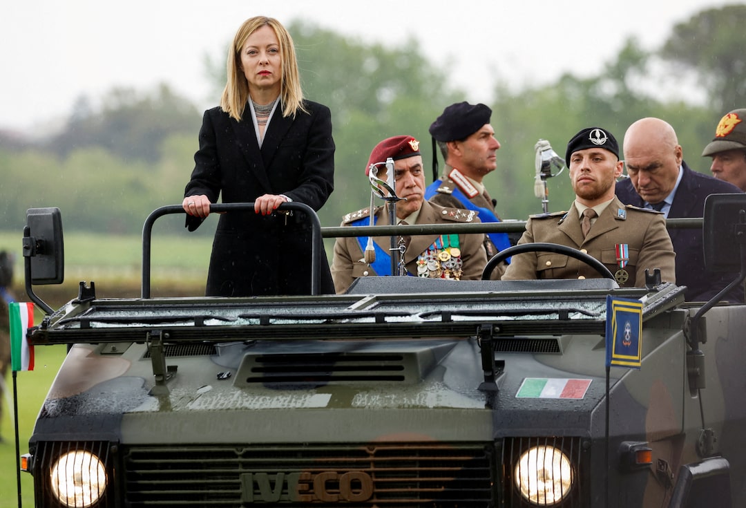意大利总理乔治亚·梅洛尼在2024年5月3日于意大利罗马出席意大利军队163周年纪念仪式时检阅仪仗队。路透社/雷莫·卡西利/档案照片