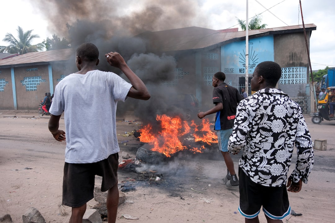 项目 1 共 3 抗议者在2025年1月28日民主刚果金沙萨的示威中焚烧轮胎和其他物品。路透社/贾斯廷·马康加拉
