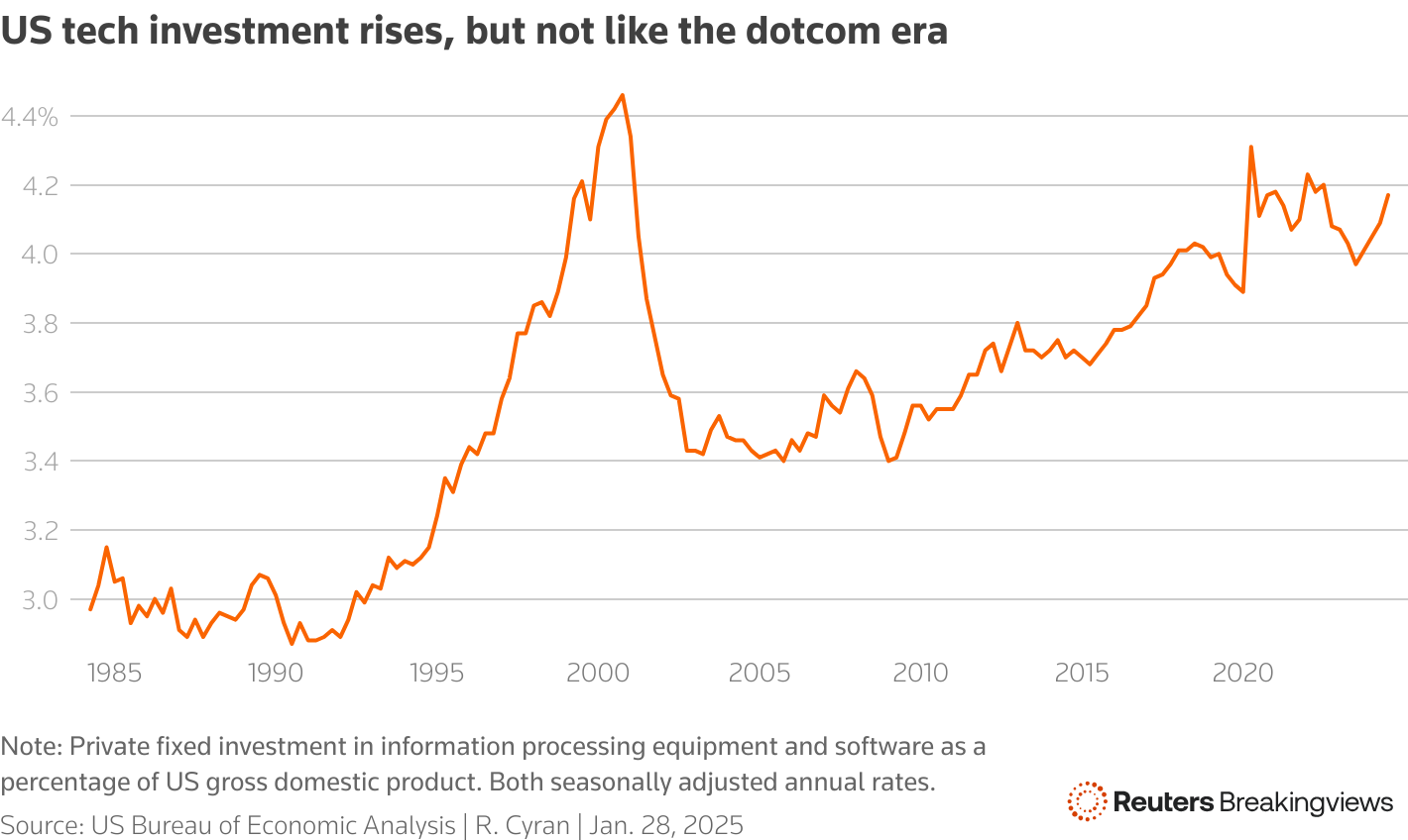 美国私营部门在技术上的投资随着时间的推移逐渐上升。最近的增长与互联网泡沫时期的激增相比显得微不足道。