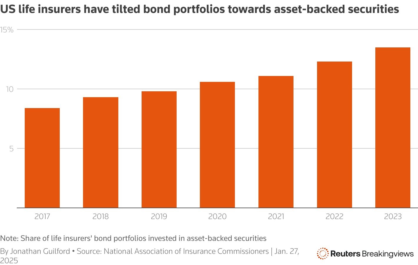 一张显示ABS在寿险投资组合中日益重要性的图表