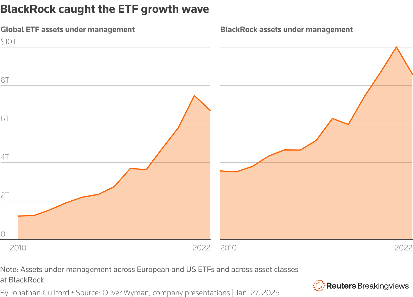 一张显示全球 ETF 市场和黑石资产管理规模增长的图表