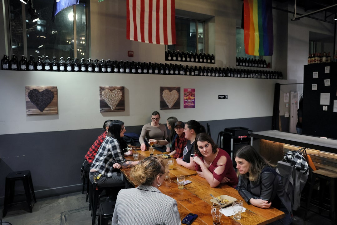 第1项,共8项 安吉拉·特罗斯卡,海岸警卫队,拥抱海军的维维安·贾奎斯,与空军的埃琳·克里泽克聊天,同时美国海军的指挥官艾米莉·希林和美国海军陆战队退休的维护与生产控制主任莎拉·克里姆在华盛顿的红熊酿酒公司与SPARTA成员会面,SPARTA是一个为曾在军队服役或正在服役的跨性别者提供资源的非营利组织,时间为2025年1月19日。路透社/莉亚·米利斯