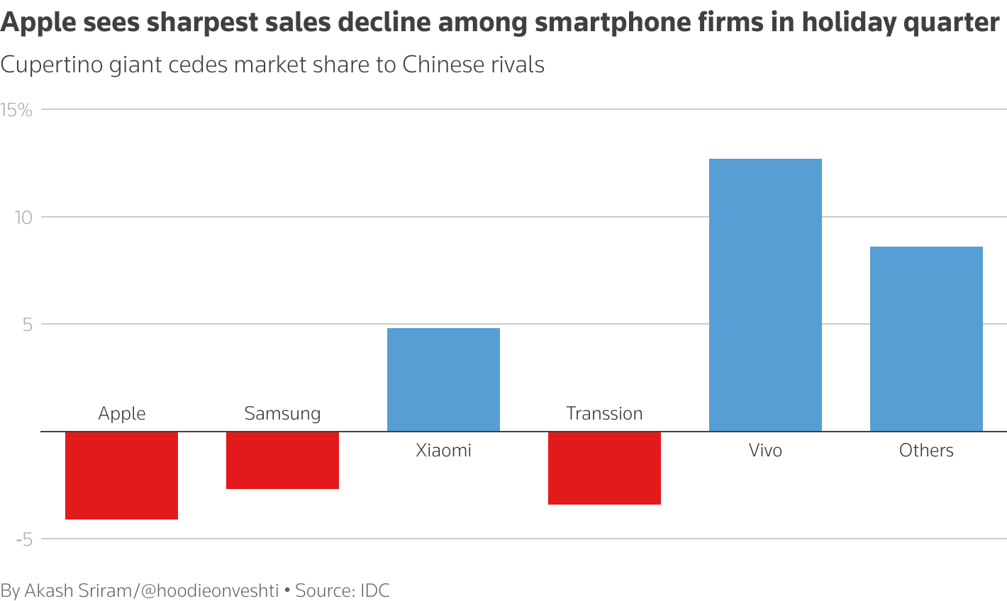 数据显示,中国作为苹果第三大市场,其市场份额下降幅度更大,下降了10个百分点至17%。