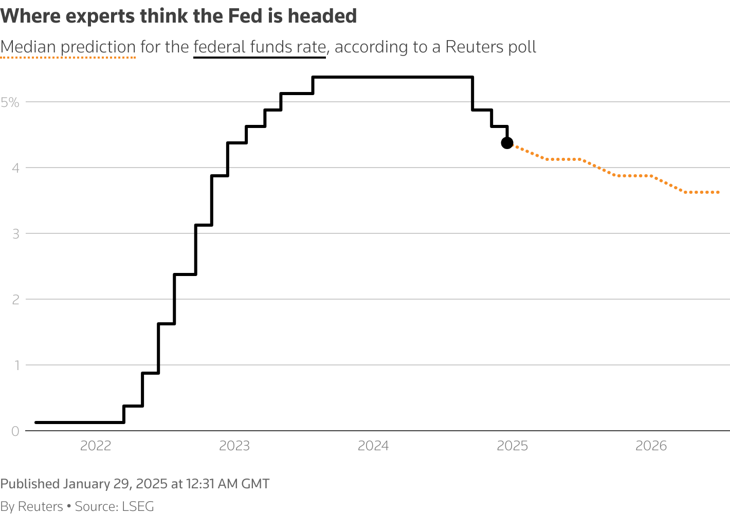 一条线图显示了联邦基金利率目标中点的中间值和路透社调查中的中位数预测。