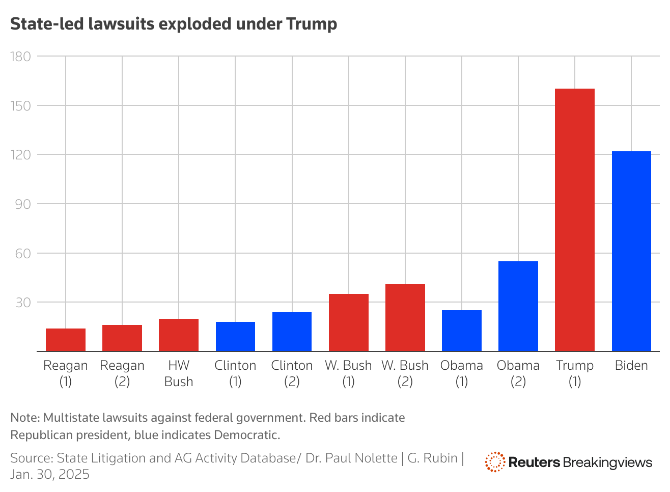 一张柱状图显示了按总统任期对联邦政府的州诉讼,特朗普第一任期内有显著增加。