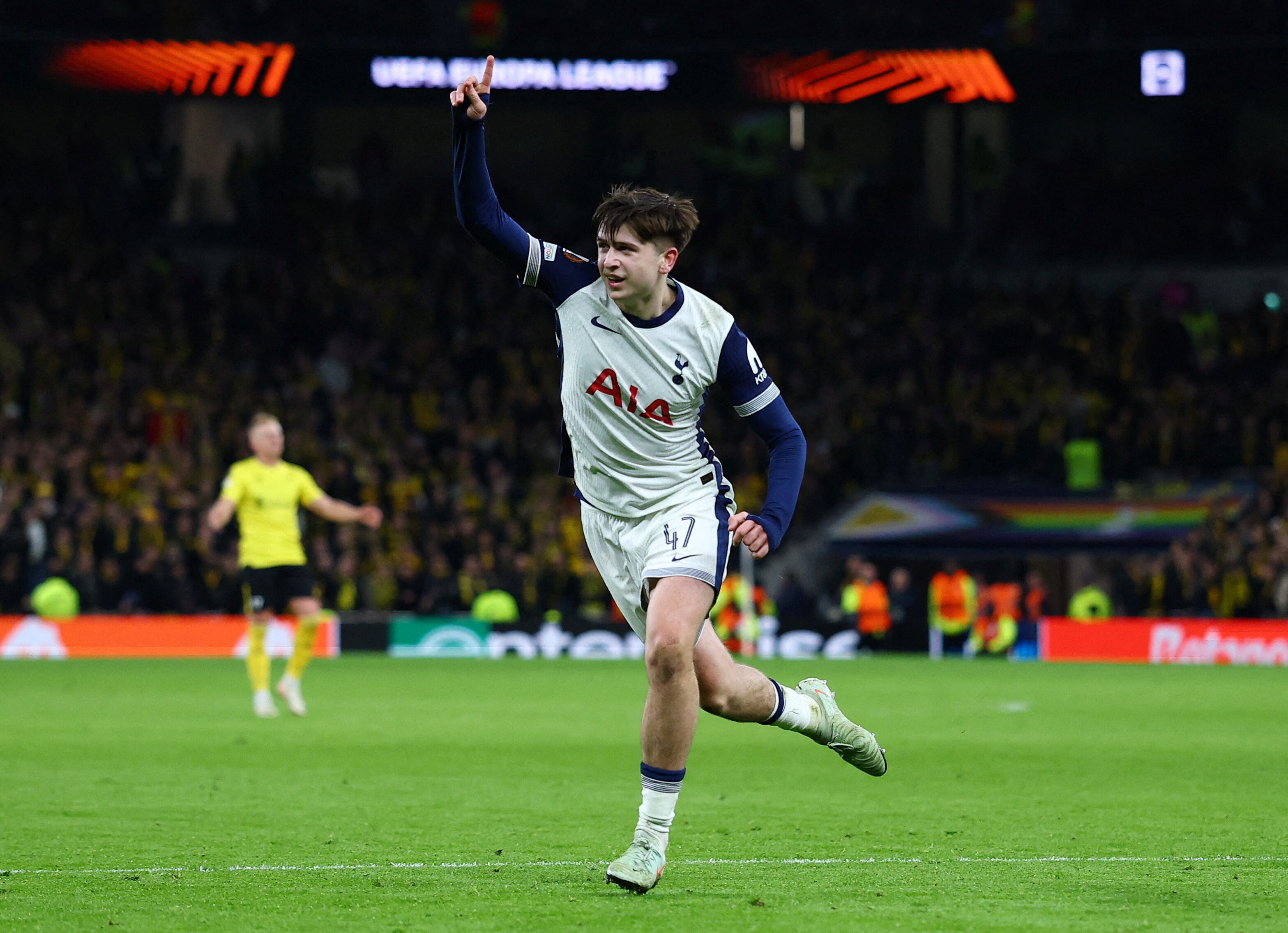 迈基·摩尔庆祝在2025年1月30日的欧洲足球联赛中对阵埃尔夫斯堡的第三个进球。摄影:马修·查尔兹 - 路透社曼彻斯特(英格兰)1月30日(阿拉伯路透社体育服务) - 热刺以3-0战胜瑞典的埃尔夫斯堡,晋级欧洲足球联赛16强,年轻球员丹·斯卡莱特、达莫拉·阿贾伊和迈基·摩尔首次为球队进球。