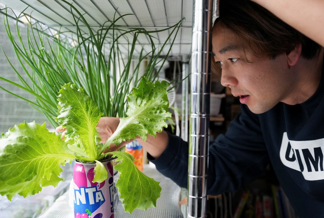 中田在 2023 年辞去了电子零售商的工作,专注于他目前在家中种植的 47 种蔬菜。从紫苏叶、洋葱到大根,所有这些都在空塑料瓶、啤酒罐甚至他的自行车篮子里茁壮成长。