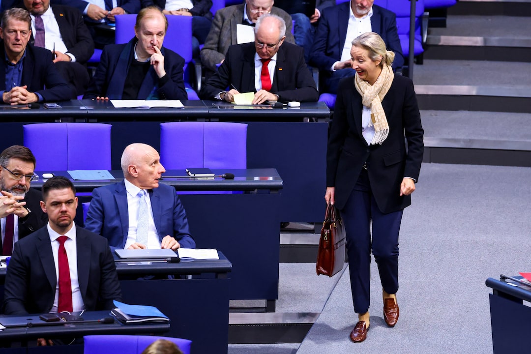 第1项,共2项,德国选择党(AfD)共同领导人爱丽丝·韦德尔在德国柏林,德国联邦议院(Bundestag)召开会议当天,对基督教民主联盟(CDU)党首弗里德里希·梅茨成功推动一项要求加强移民管控的动议表示反应,该动议包括在国家陆地边界拒绝庇护申请者,日期为2025年1月31日。路透社/纳杰·沃尔勒本