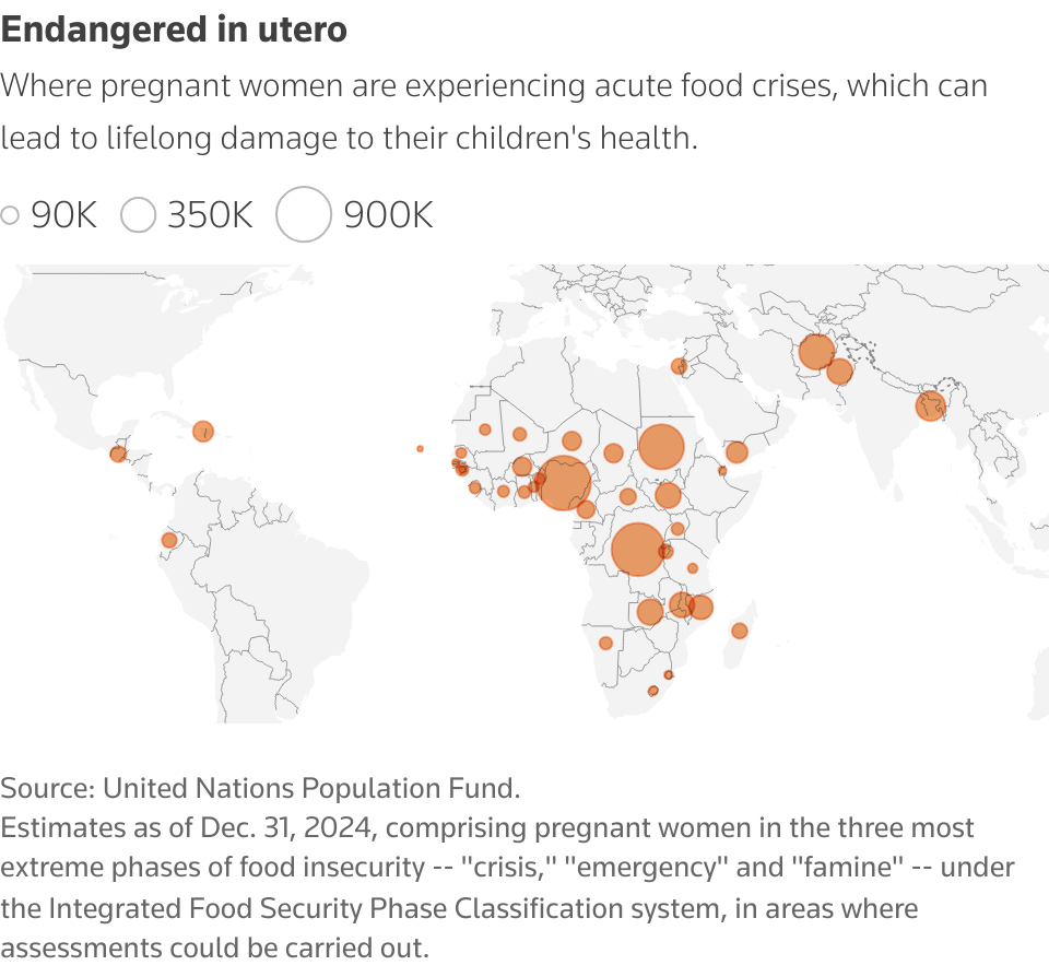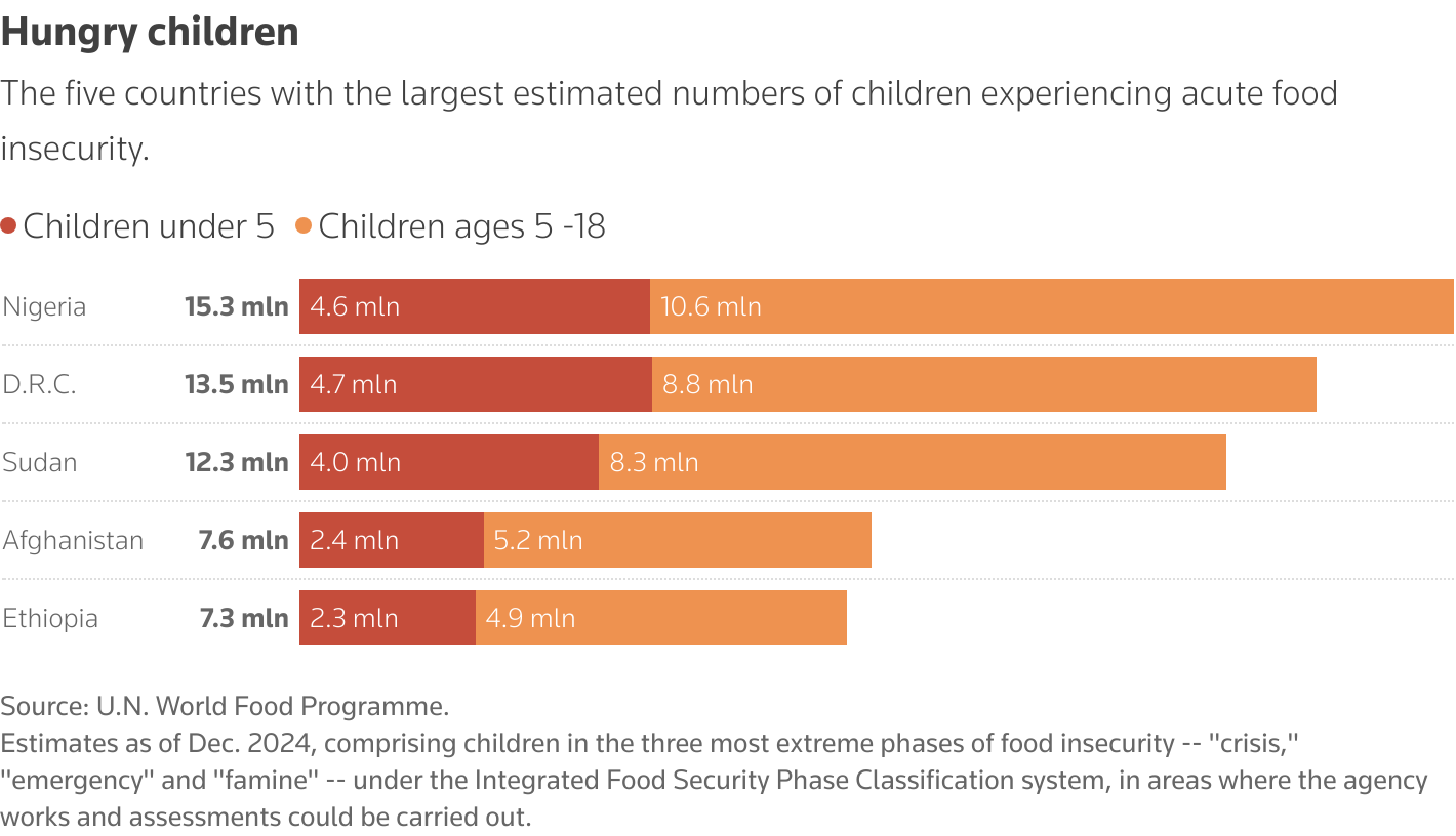 这一令人担忧的前景是全球紧急关注的问题。正如路透社在一系列文章中报道的 ,饥荒和其他严重的食品危机在过去一年中席卷了发展中国家的各个地区,从海地到阿富汗,再到苏丹以及许多其他非洲国家,还有加沙。根据联合国世界粮食计划署独家提供给路透社的估计,全球约有1.31亿儿童,近4000万名儿童年龄在5岁以下,生活在经历严重食品危机的地区。联合国人口基金会表示,近470万名孕妇生活在这些地区。联合国的估计基于可以进行评估的国家的最新数据。