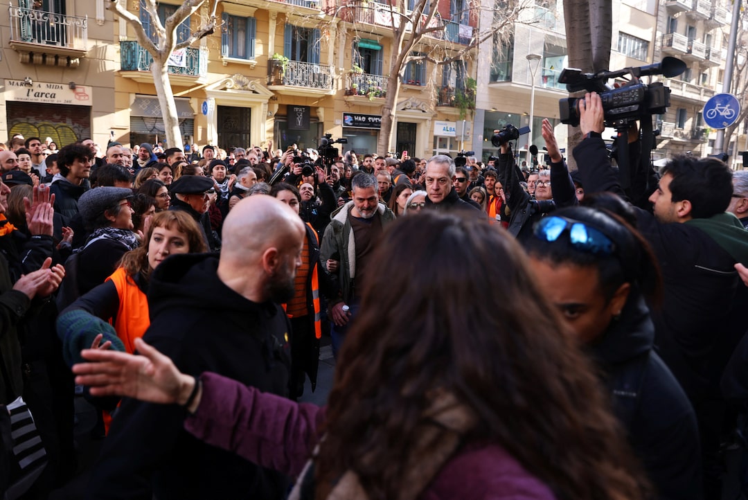 第1项,共5项 教师Josep Torrent(C),49岁,在被告知他的驱逐将在下周二早上进行后作出反应,他在居民和租户工会的包围下走动,以防止名为Casa Orsola的建筑物被驱逐,该建筑物已成为巴塞罗那住房危机的象征,地点在西班牙巴塞罗那,2025年1月31日。路透社/Nacho Doce